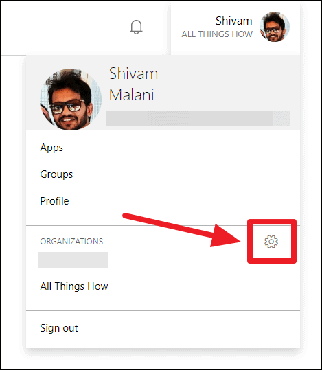 Step 5: After signing in to the organization's account, click on your profile name or icon again, and select the Settings gear icon next to Organizations.