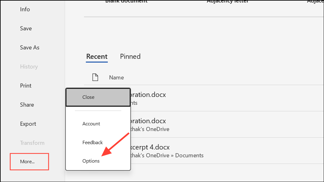 Step 2: Select Options from the menu on the left. This brings up the Word Options dialog box, which controls various settings for how Word operates. Click More if you cannot see Options directly.