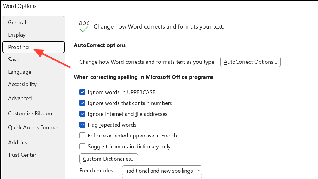 Step 3: In the Word Options dialog, click on Proofing in the list on the left. The Proofing section contains all settings related to spelling and grammar checks.