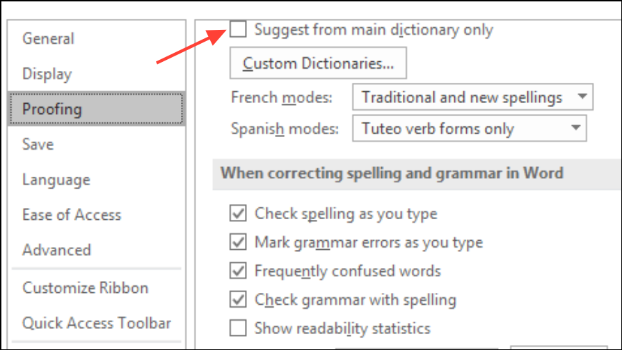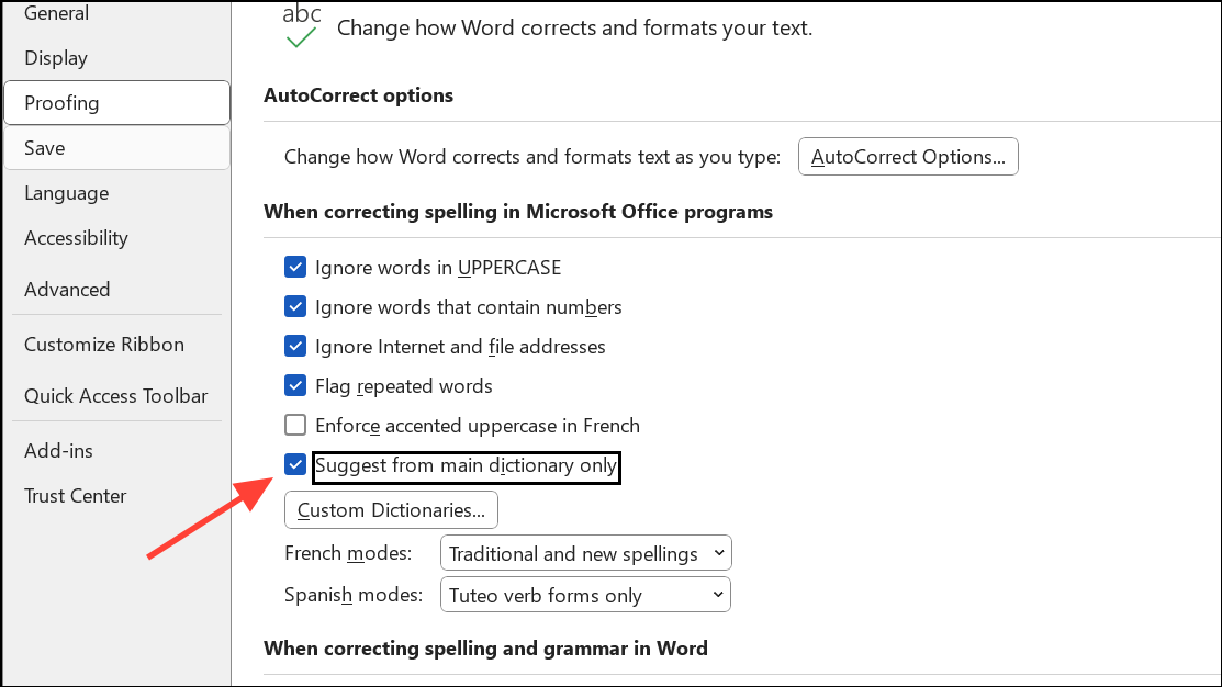 Step 4: Find the setting labeled Suggest from main dictionary only under the “When correcting spelling in Microsoft Office programs” section. Check this box. With this enabled, Word will suggest corrections only from the main dictionary, ignoring all custom dictionaries you may have added.
