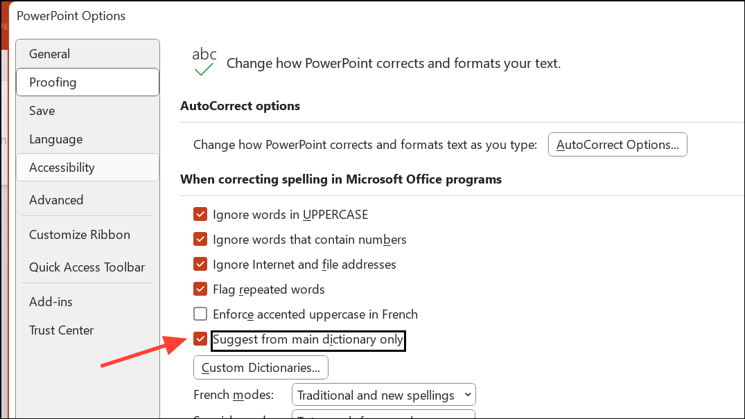 For Outlook: The process is slightly different. Open Outlook and go to File > Options. Select Mail on the left, then click Spelling and Autocorrect under the “Compose messages” section. In the Editor Options dialog, select Proofing and check Suggest from main dictionary only. Confirm by clicking OK in both dialogs.