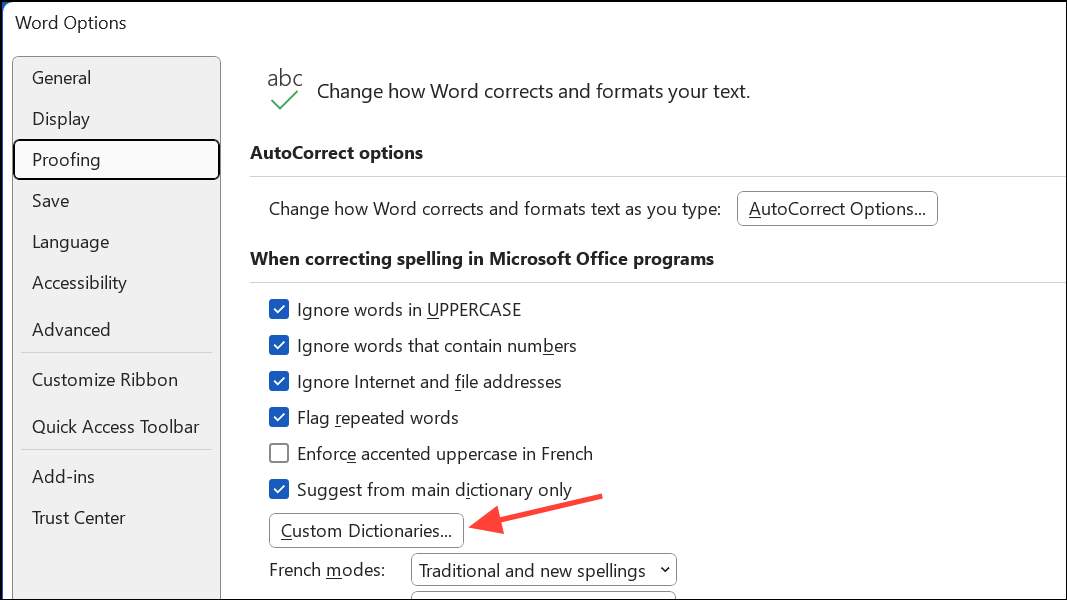 If you need to manage custom dictionaries—such as adding or removing words, or creating new dictionaries—return to the Proofing section in Options and click Custom Dictionaries. Here, you can edit existing dictionaries or set a different default dictionary for saving new words.