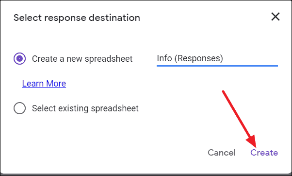 Step 2: A dialog box will appear, offering you the option to create a new spreadsheet or select an existing one. By default, a new spreadsheet with the same name as your form will be created, but you can rename it if you prefer. Click Create to proceed.