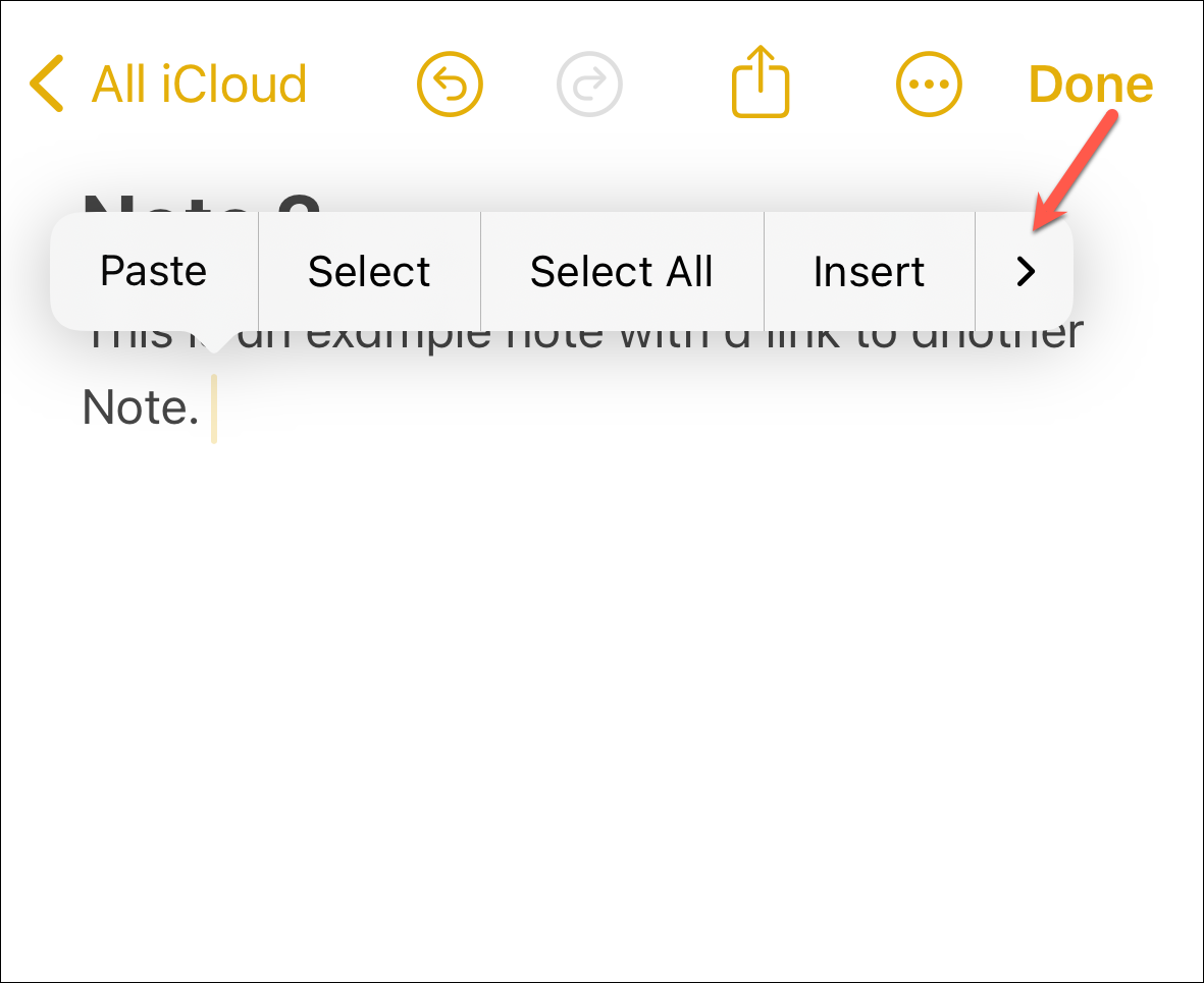 So, either long-press on empty space in the note or select the text you want to create the link for and tap it. Tap the '>' arrow from the pop-up menu that will materialize on your screen.