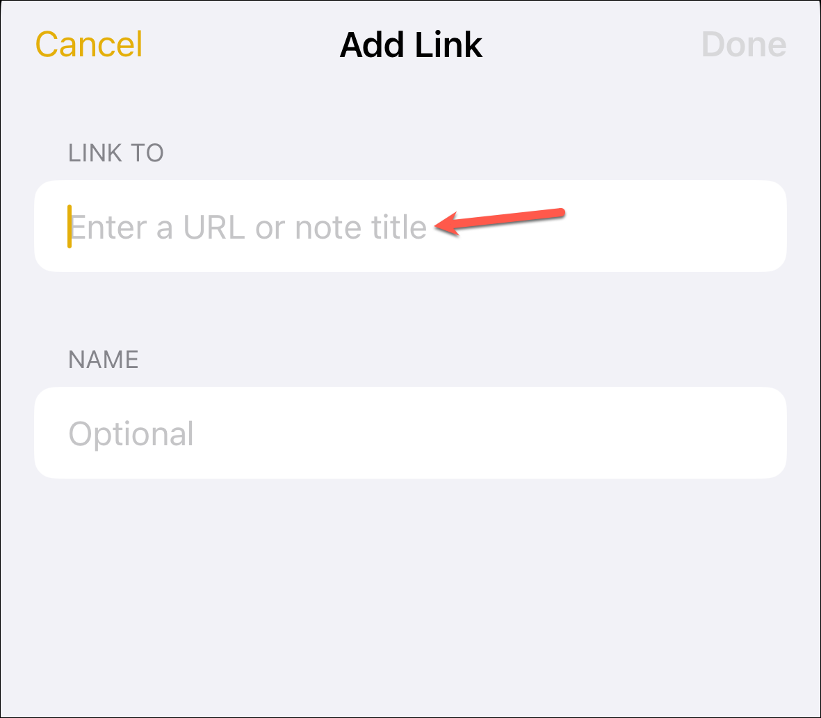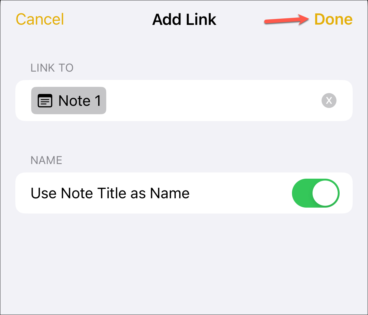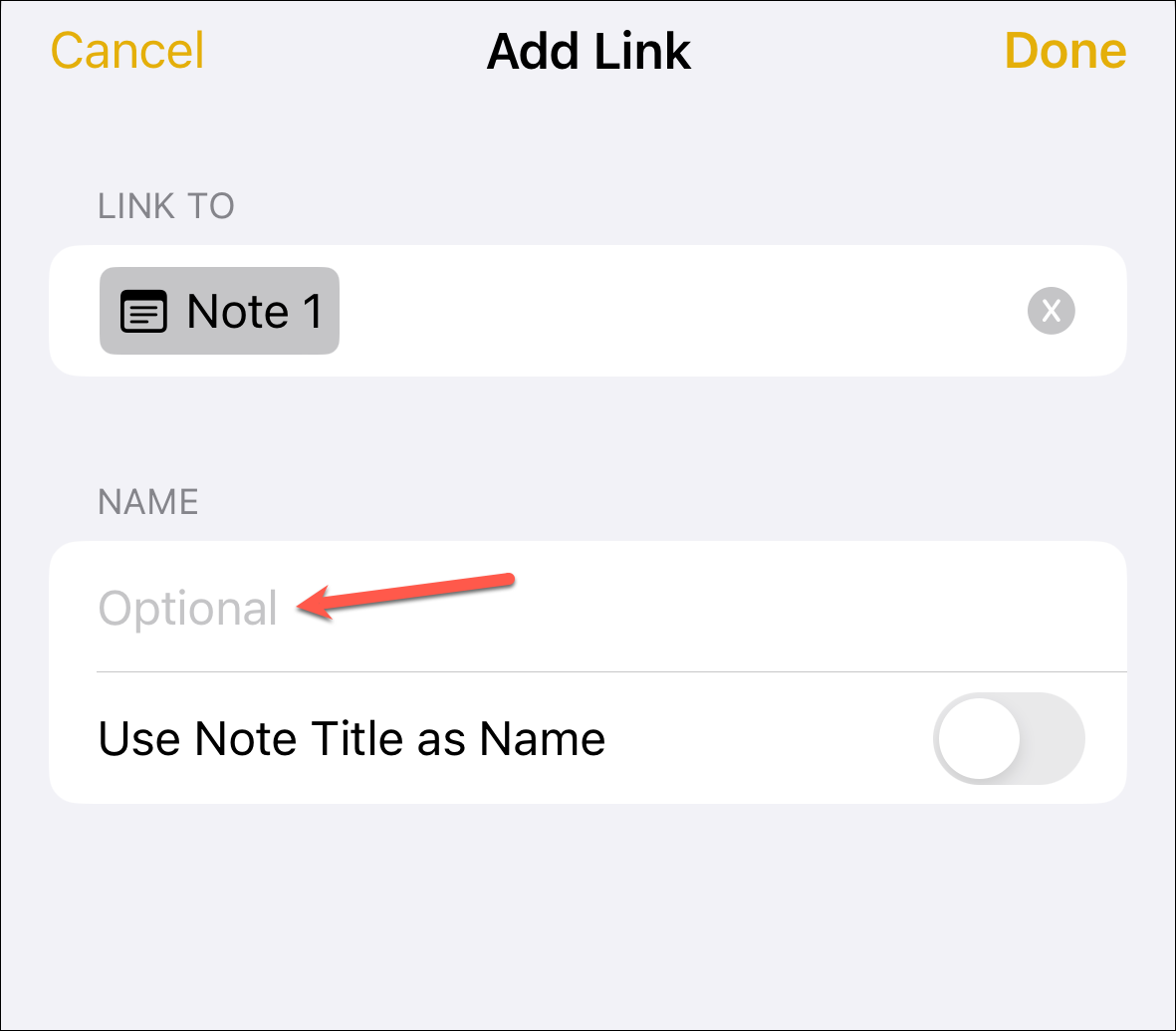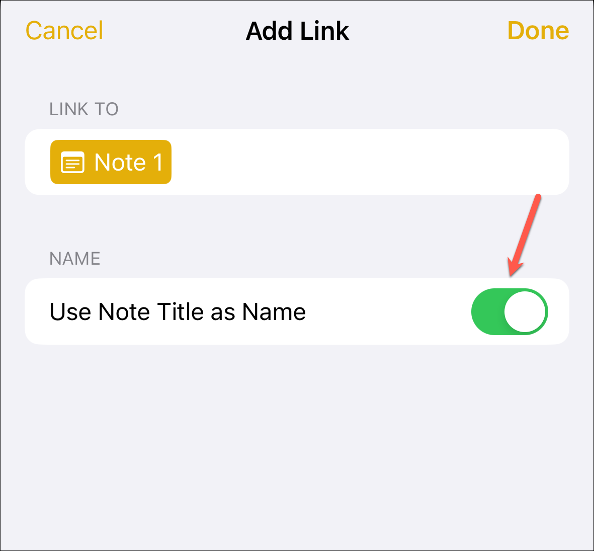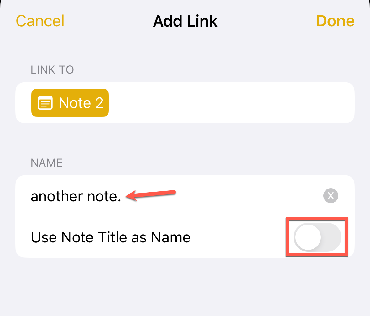 Next, you can enter a name for the link or use the note title as the name. One of the two things will happen depending on how you add the link. If you add the link to an empty place, the toggle for the 'Use Note Title as Name' option will be turned on by default. This is the best option if you're a fan of simplicity; the original title will result in a clear, crisp, and unambiguous linkage.