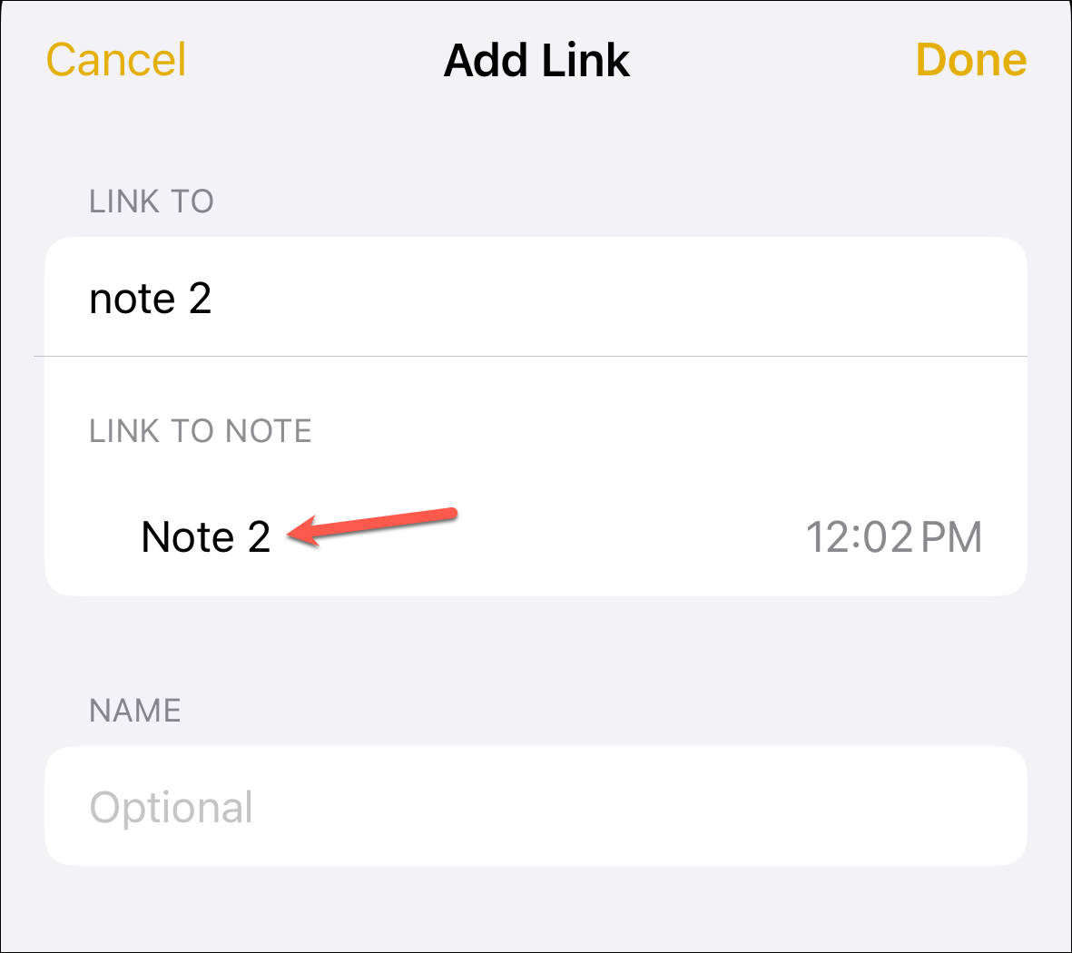 Then, tap on the desired note from the search results to link to it.
