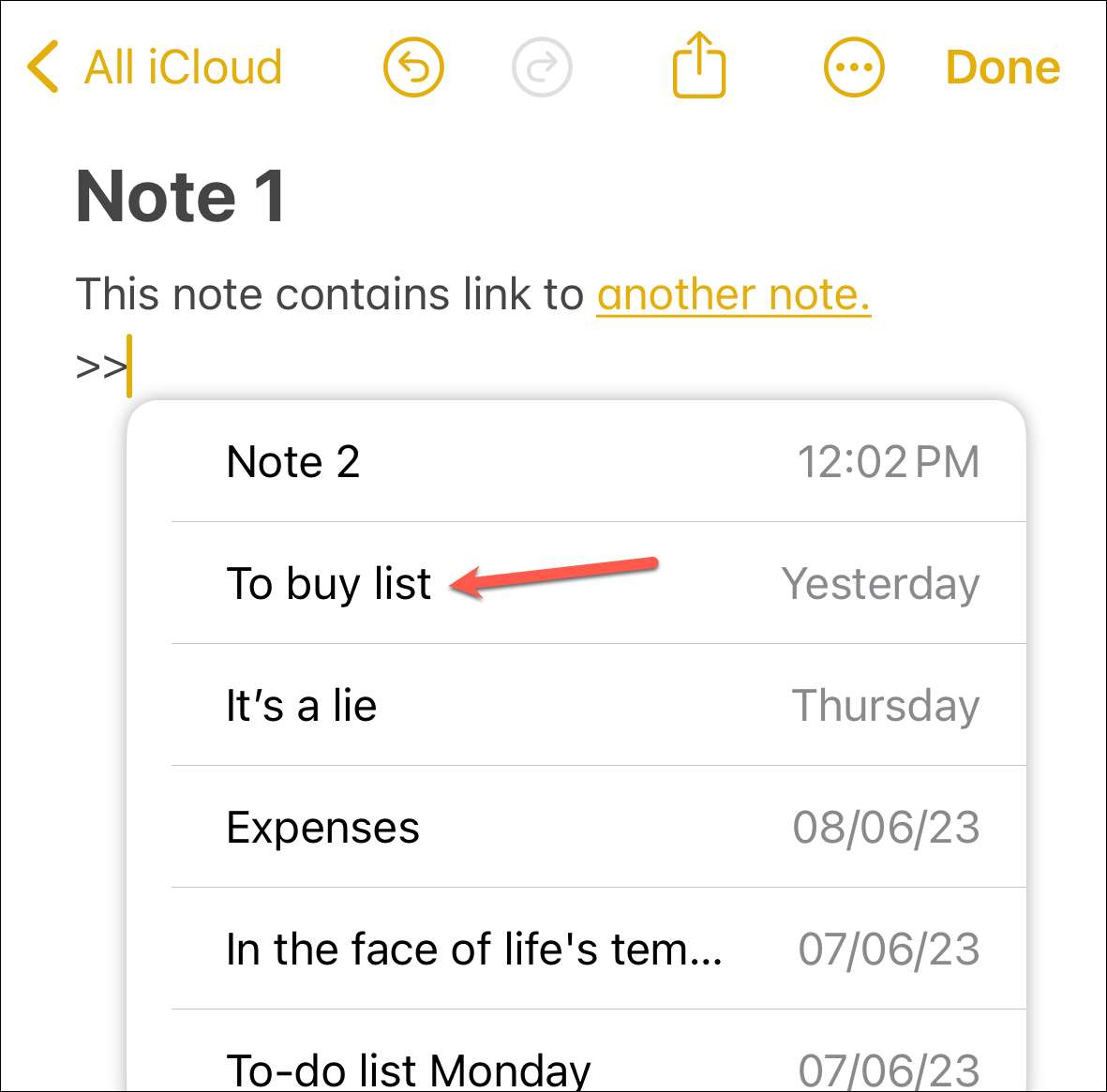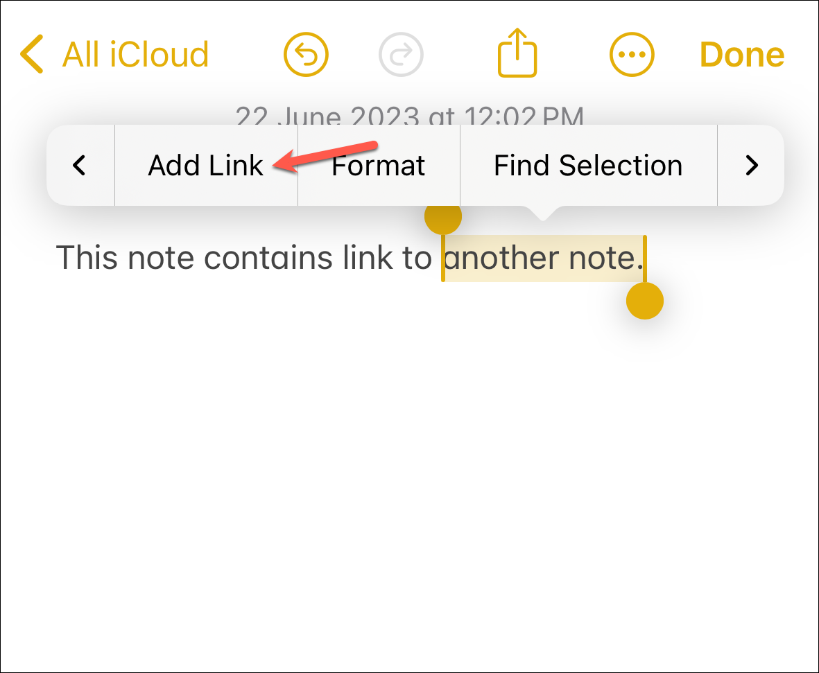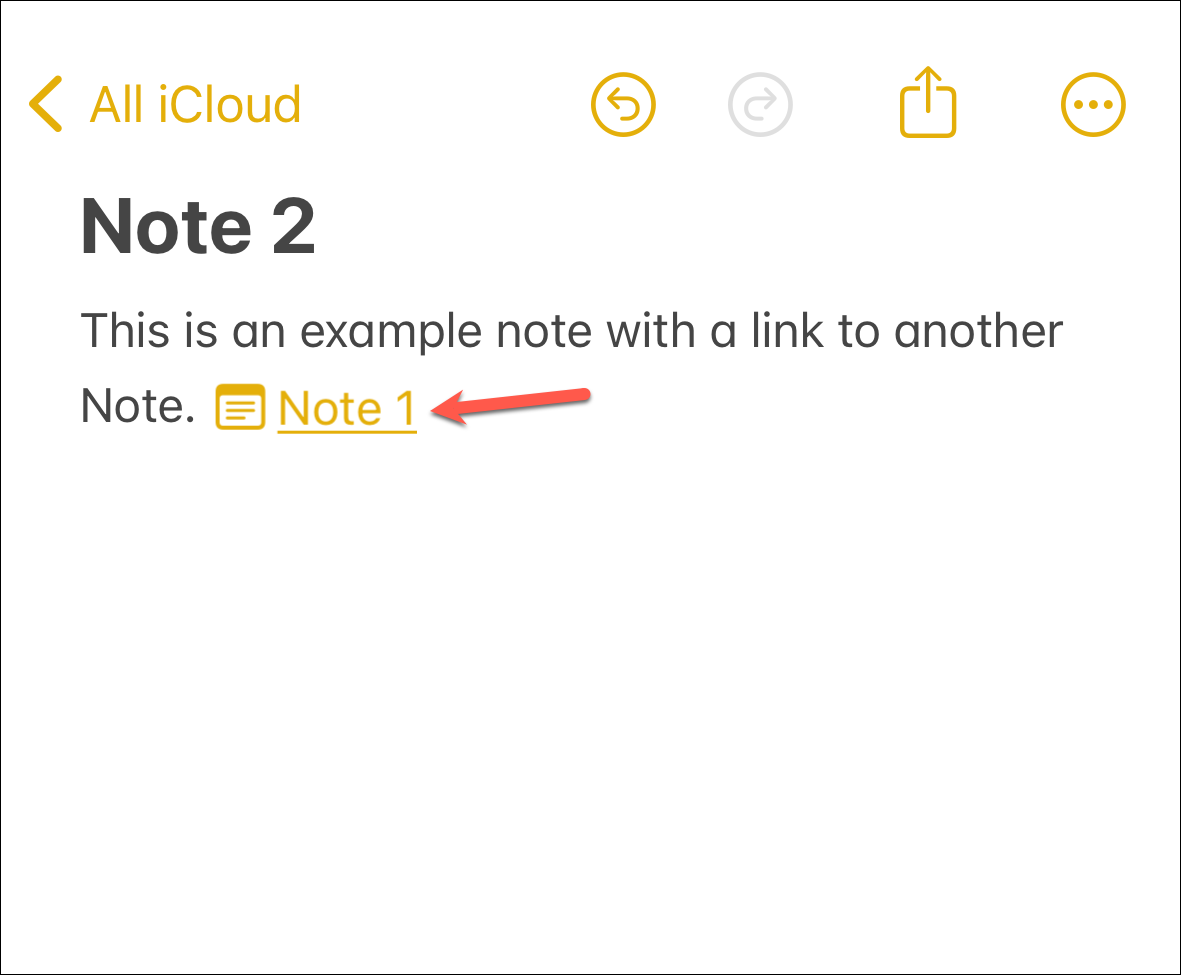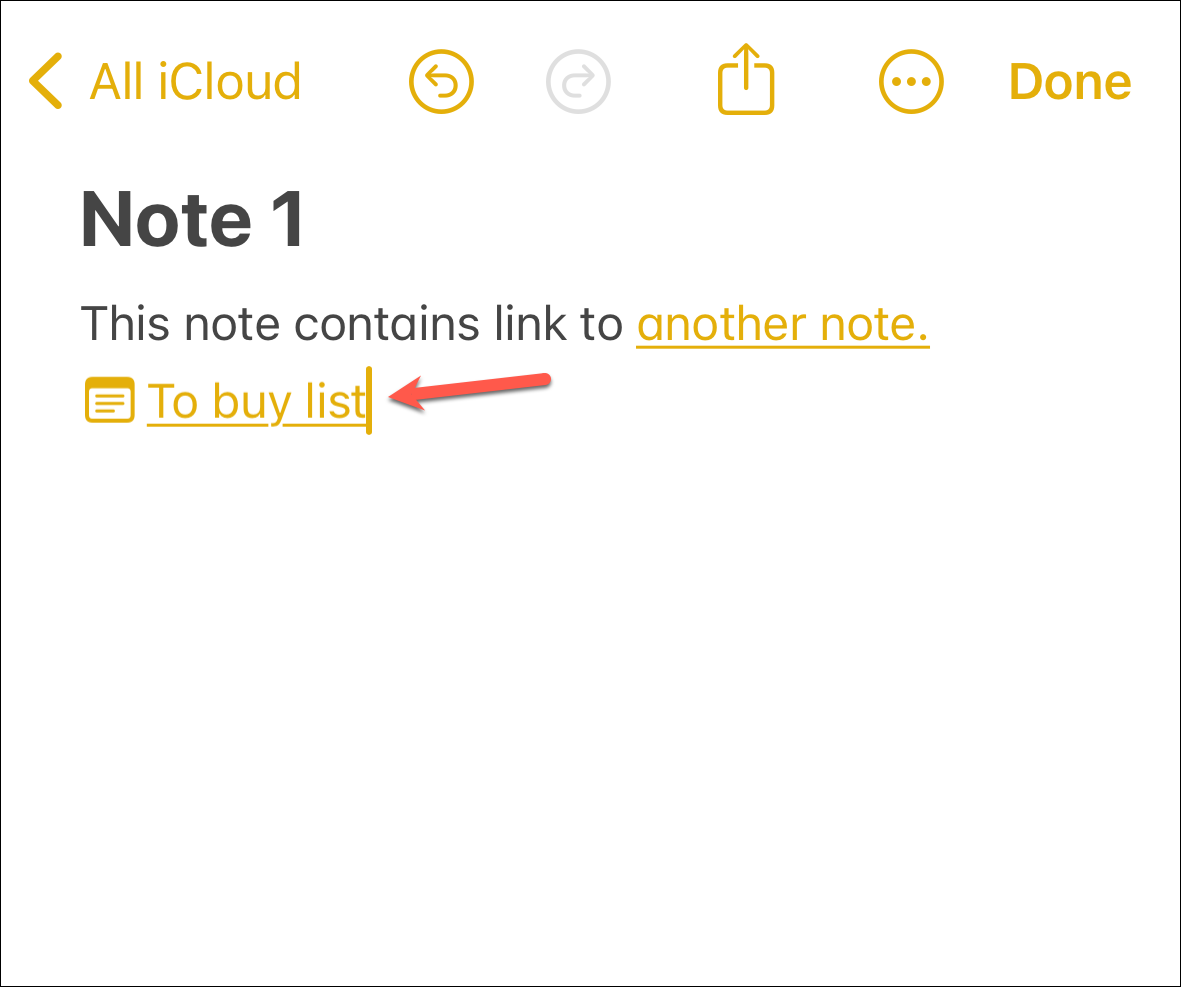 Once you're done, the link appears as a charming piece of underlined text in the classic Notes yellow color, waiting eagerly for your tap to whisk you away to the note you linked to.