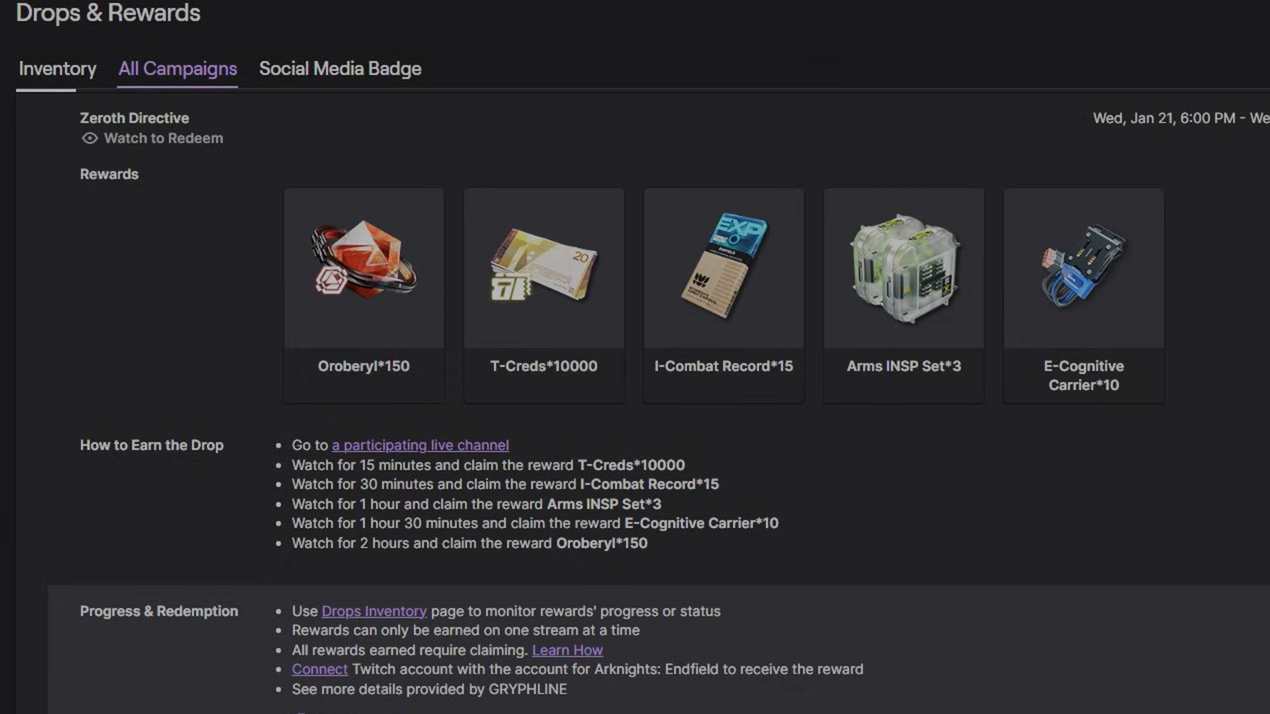 Watch time was cumulative — you didn't need to hit every milestone in a single session. Progress counted across any stream in the Arknights: Endfield category on Twitch, regardless of the streamer's viewer count.