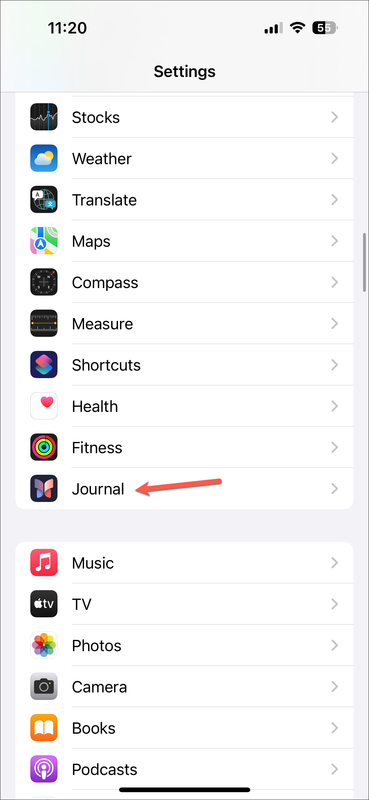 - Then, scroll down and tap the option for the 'Journal' app.