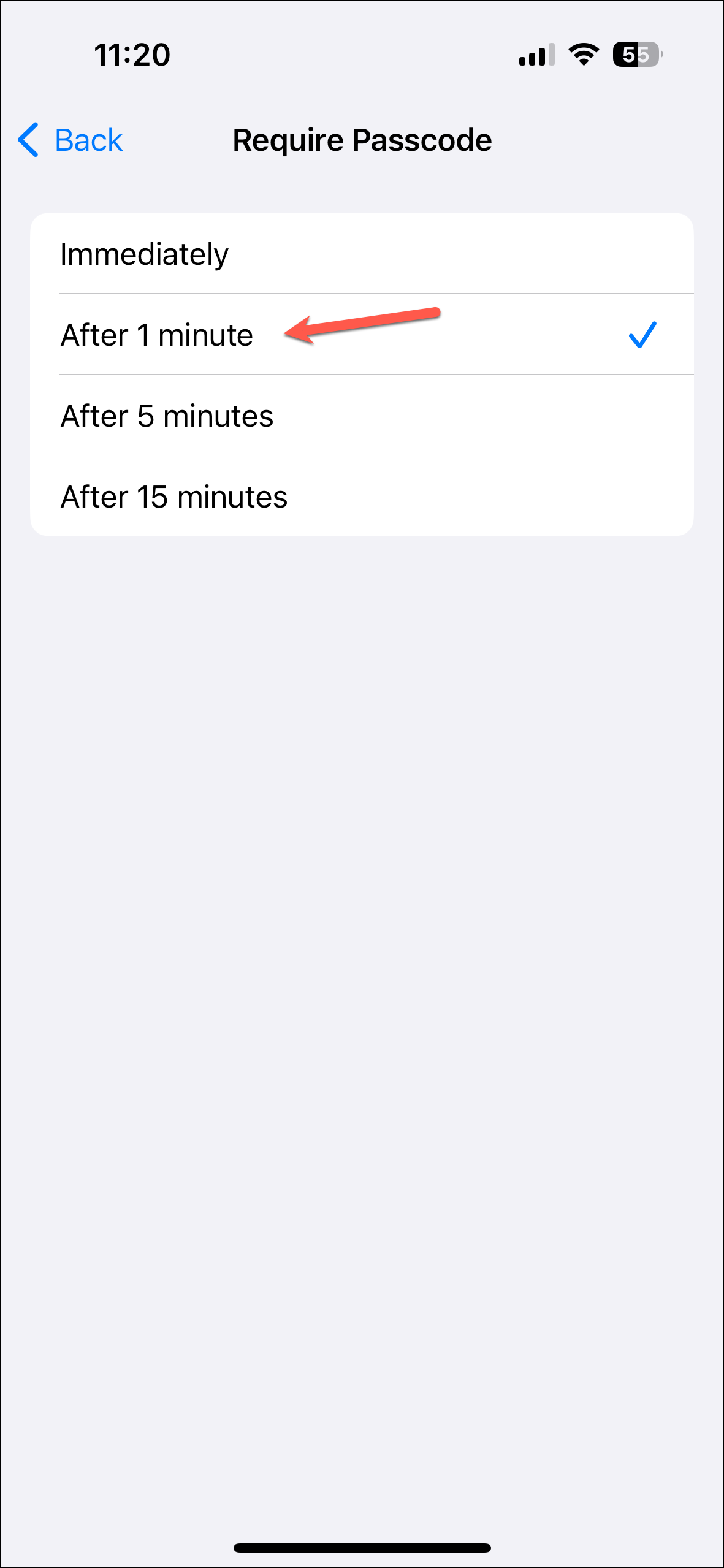 - Here, you can select the time after which the Journal app should ask for a passcode after being closed from the screen. Options include 'Immediately', 'After 1 minute', 'After 5 minutes', and 'After 15 minutes'; tap the option to select it.