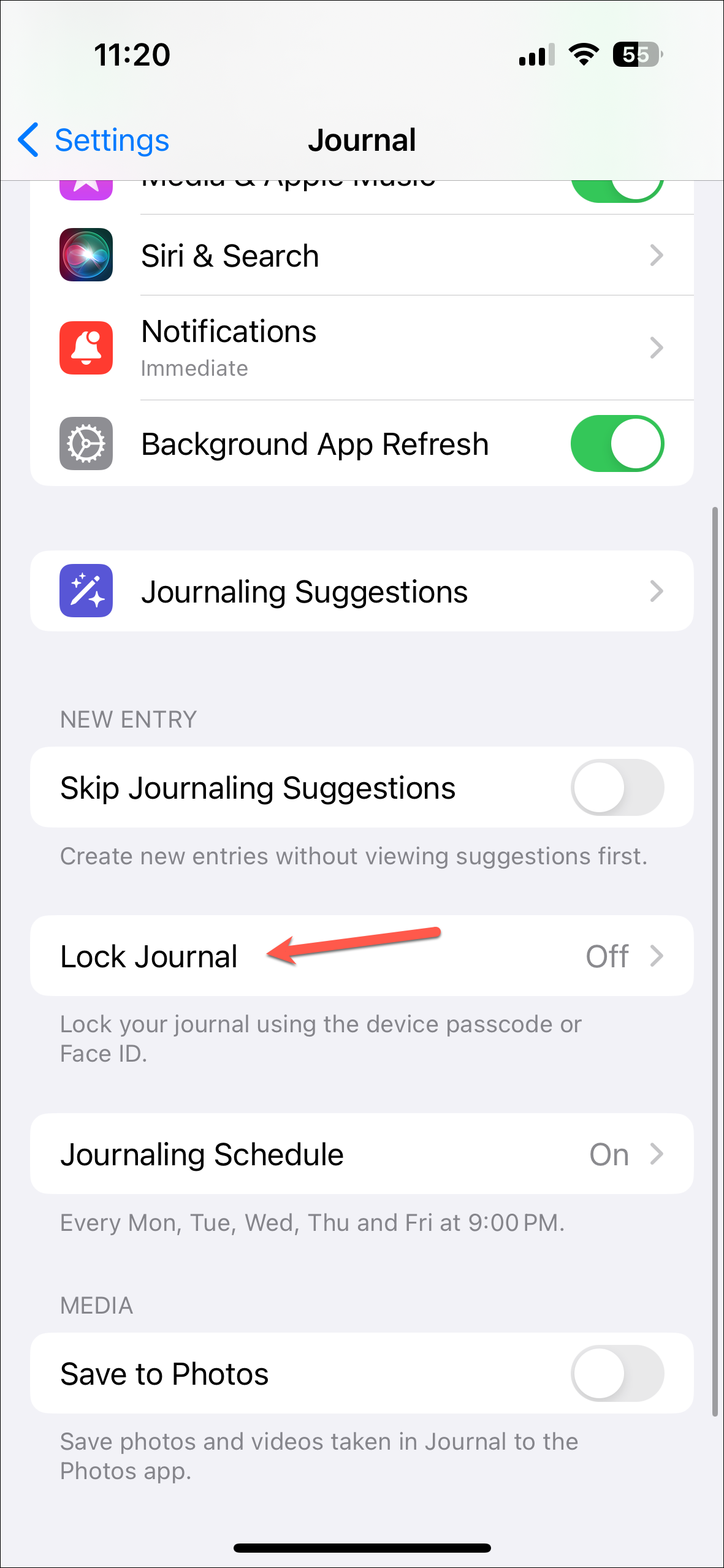 - In the Journal settings, scroll down slightly and tap the option for 'Lock Journal'.