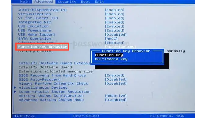 - Look for 'Function Key Behavior' or a similar option in the BIOS. It may be present under 'Advanced' or some other tab. Navigate to that option and press Enter and you can control whether the Function Keys act as multimedia keys or perform their own functions.