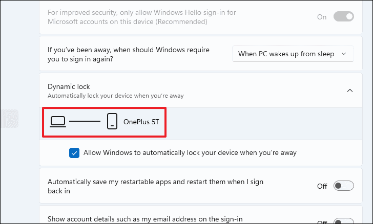 - Windows will automatically detect your paired phone and display it under the Dynamic Lock settings.