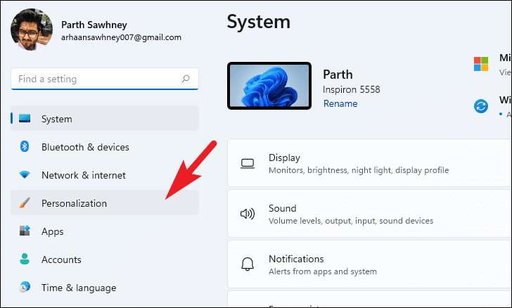 - In the Settings window, select Personalization from the left sidebar.