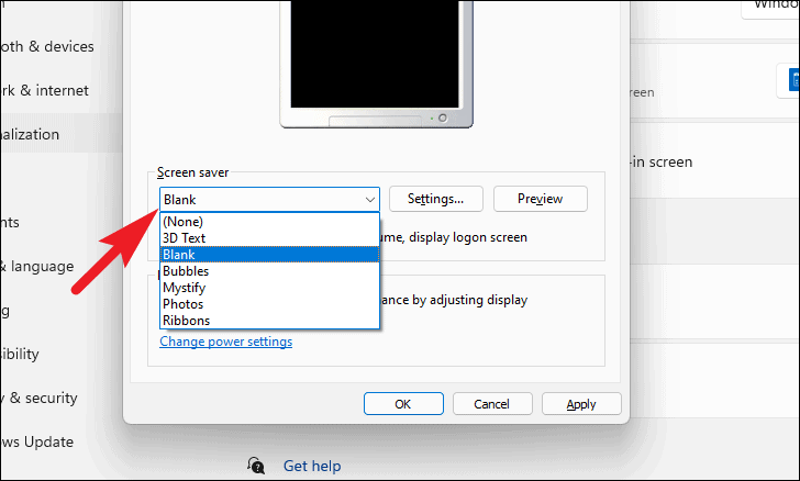 - Scroll down to the Related settings section and click on Screen saver. The Screen Saver Settings window will open.