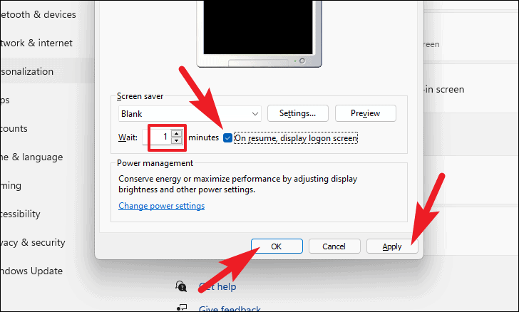- Set the time after which the screen saver activates by entering the number of minutes next to Wait:. Check the box next to On resume, display logon screen to require a password when resuming. Click Apply, then OK to save your changes.