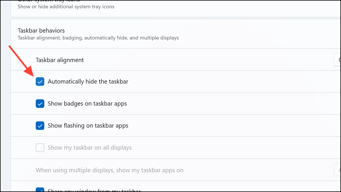Step 2: Under the "Taskbar behaviors" section, locate the option labeled "Automatically hide the taskbar." Enable this option by clicking inside the checkbox to enable it. This setting ensures the taskbar automatically hides whenever you open an application or window, giving you more screen space for your work.
