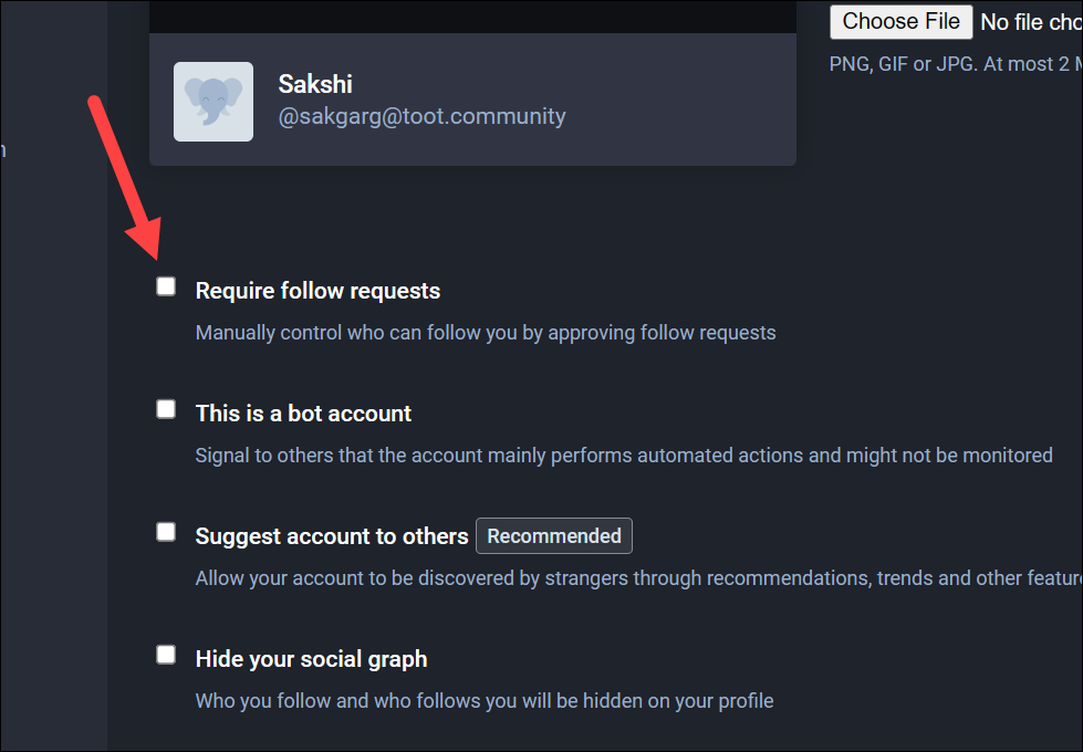 Then, scroll beyond the display name and bio section and enable the checkmark for ‘Require follow requests’.