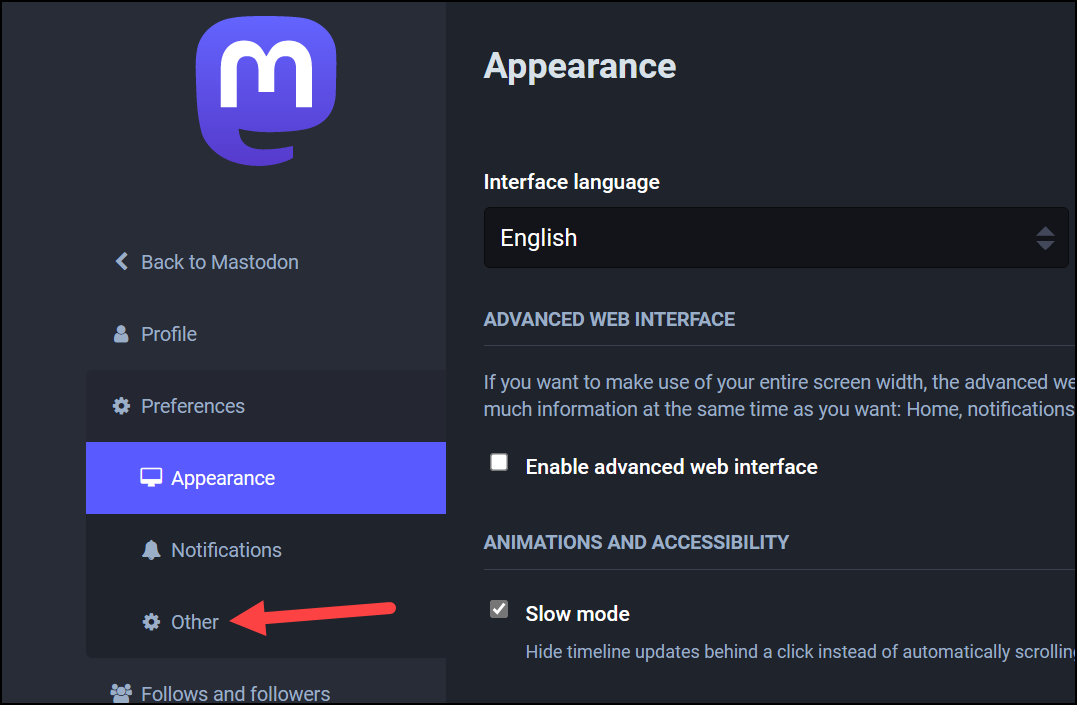 Then, choose ‘Other’ instead of ‘Appearance’ in the Preferences section.