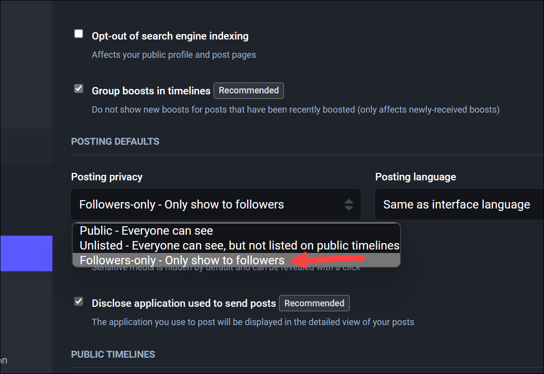 Now, click the drop-down menu under ‘Posting Privacy’ and select ‘Followers Only’ from the menu. Click ‘Save changes’ to implement it.