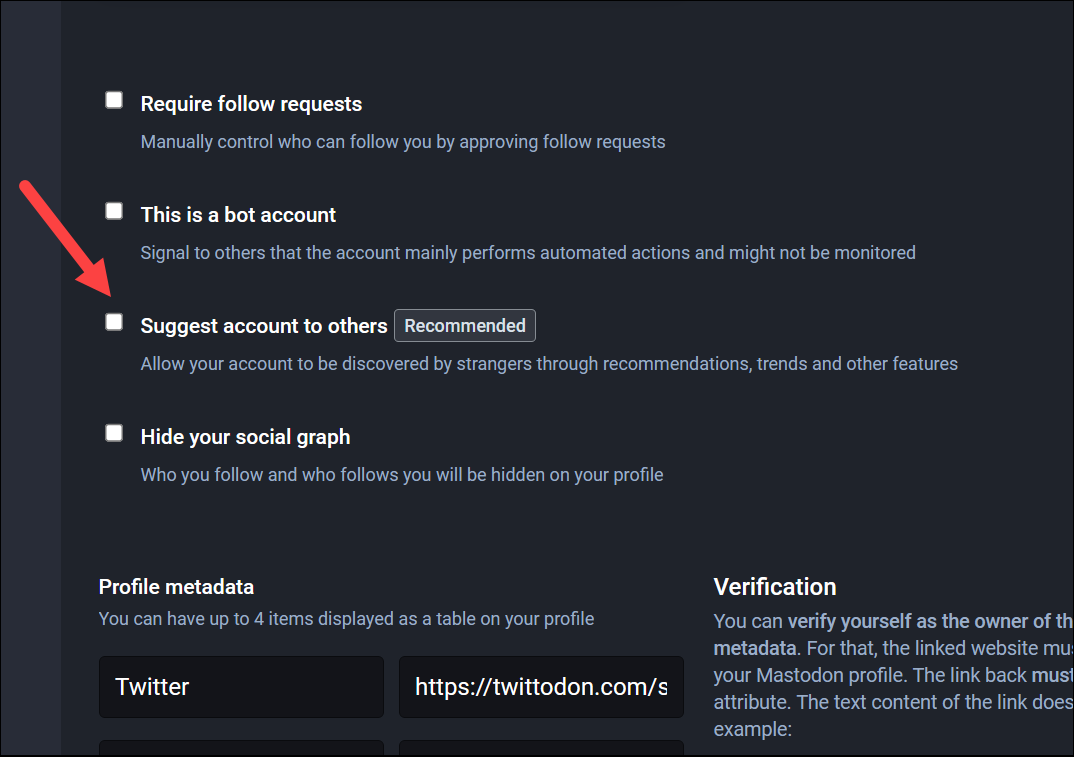 Additionally, you can also stop your account from being suggested to others through recommendations, trends, and other features. Go to the ‘Profile’ option from Preferences and then uncheck the ‘Suggest Account to others’ option.