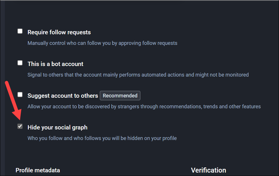 Another setting to consider is just below the option above. If you don’t want anyone to be able to see your followers and the following list, check the option for ‘Hide your social graph’. Click ‘Save Changes’ after that.