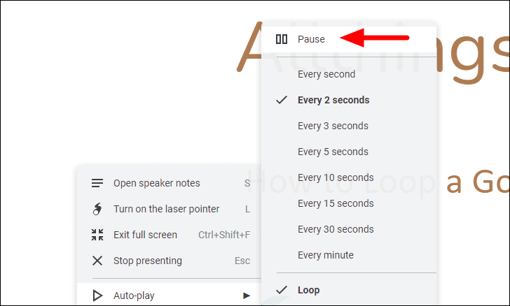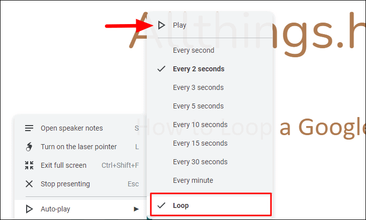 Next, click on ‘Loop’ in the context menu. A tick appears before the option after it’s selected. Google Docs also offers the option to change the time period the slides advance at ranging between 1 second to 60 seconds. After you have made the necessary selections, click on ‘Play’ at the top to start the presentation in a loop.