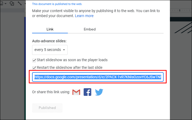 This method works great when you have to share the slides with someone. After you publish it to the web, Google Slides provides you a link to it that you can share with others.