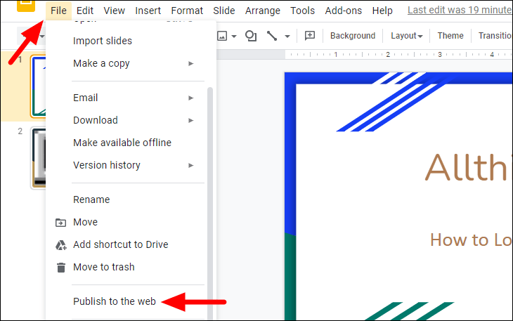 Click on the ‘File’ menu at the top and then select ‘Publish to web’ from the drop-down menu.