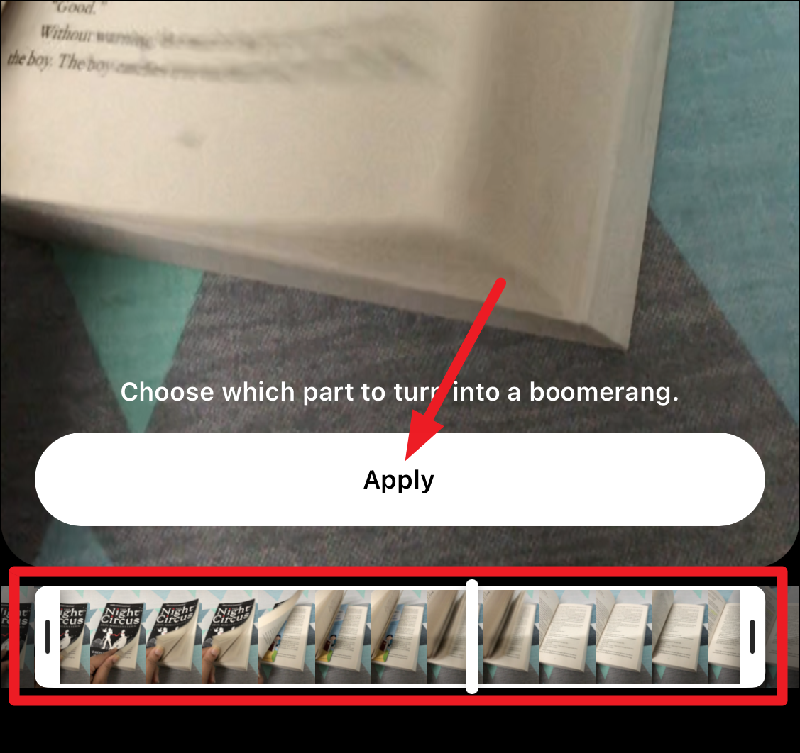 Then, select the part of the video you wish to turn into the boomerang by dragging the selector at the bottom. Tap âApplyâ after you have selected the video portion.