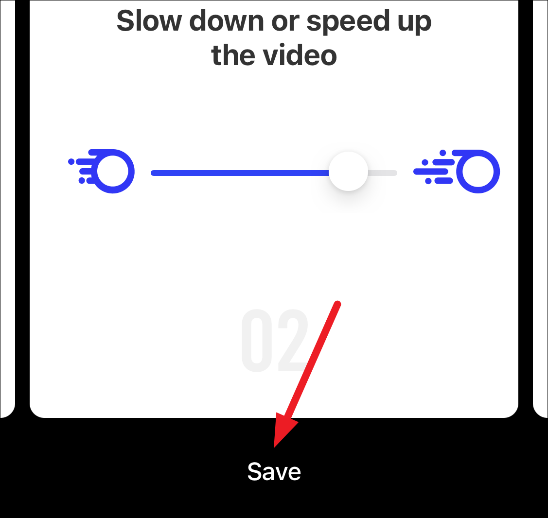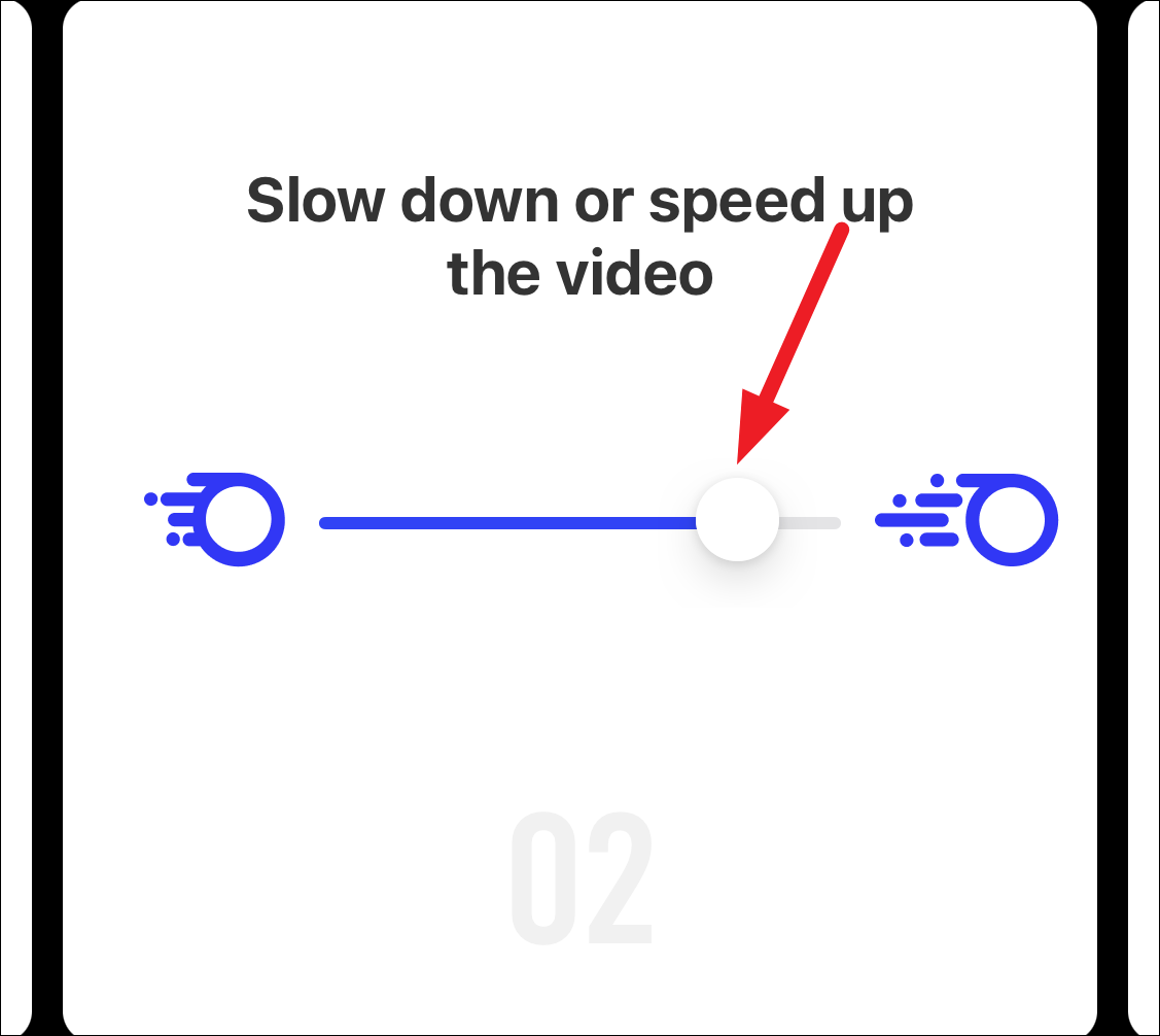 Next, swipe left on the lower part of the screen to get to the next option. Adjust the slider to slow down or speed up the video.