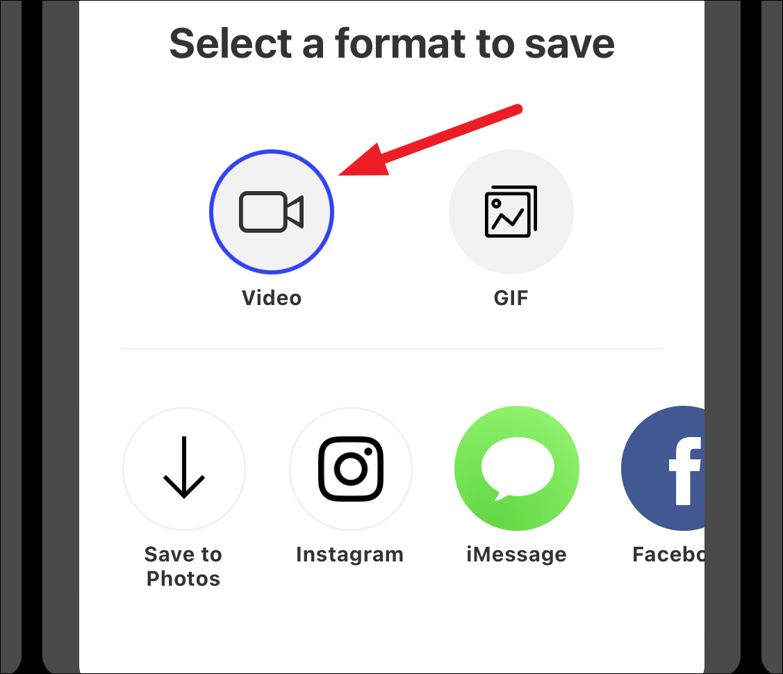 Select the format you want to save it in. You can either choose âVideoâ or âGIFâ. Then, select whether you want to save it to your gallery or share it on a social media platform.