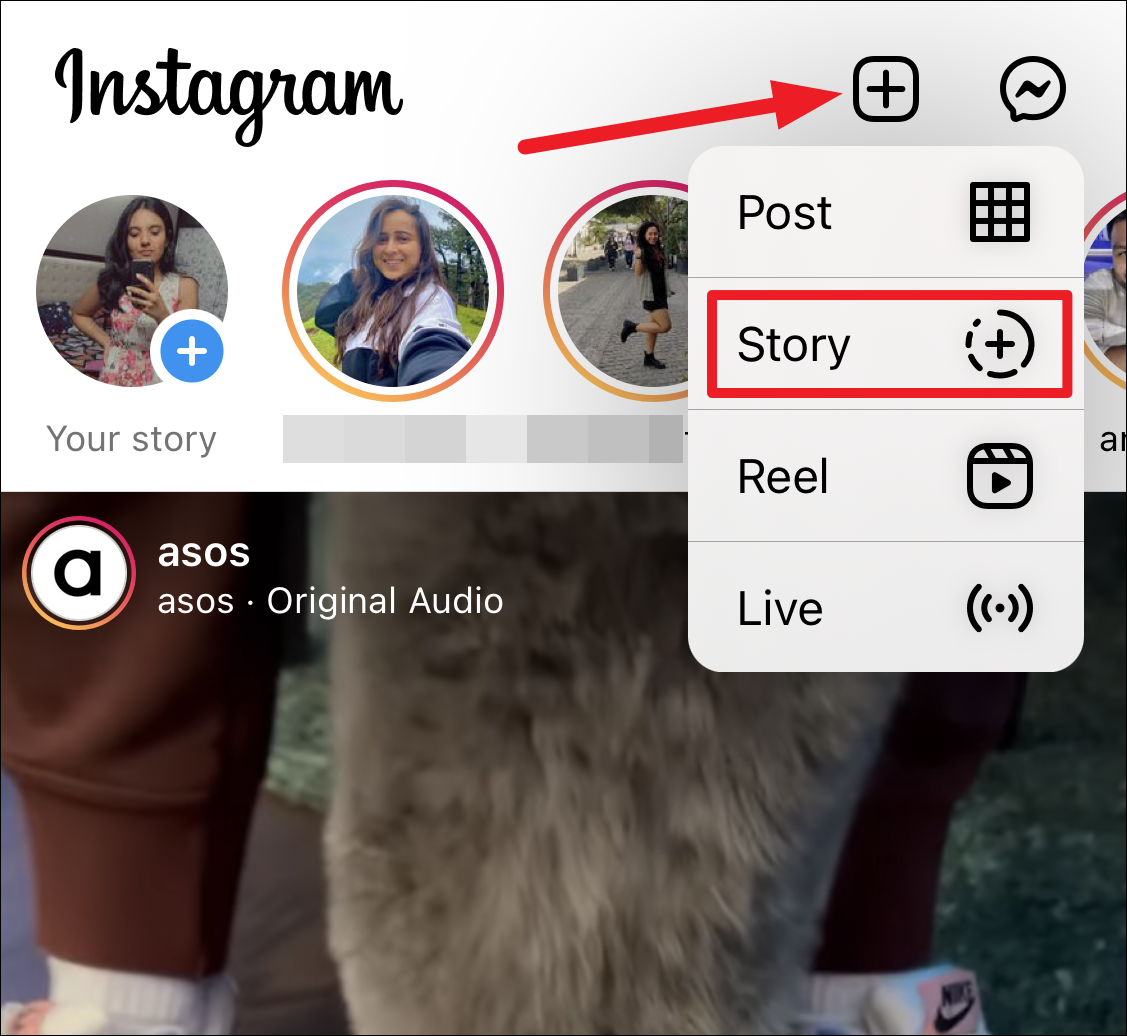Then, either swipe to the right from your feed or tap the â+â icon in the top-right corner of the screen and then select âStoryâ.