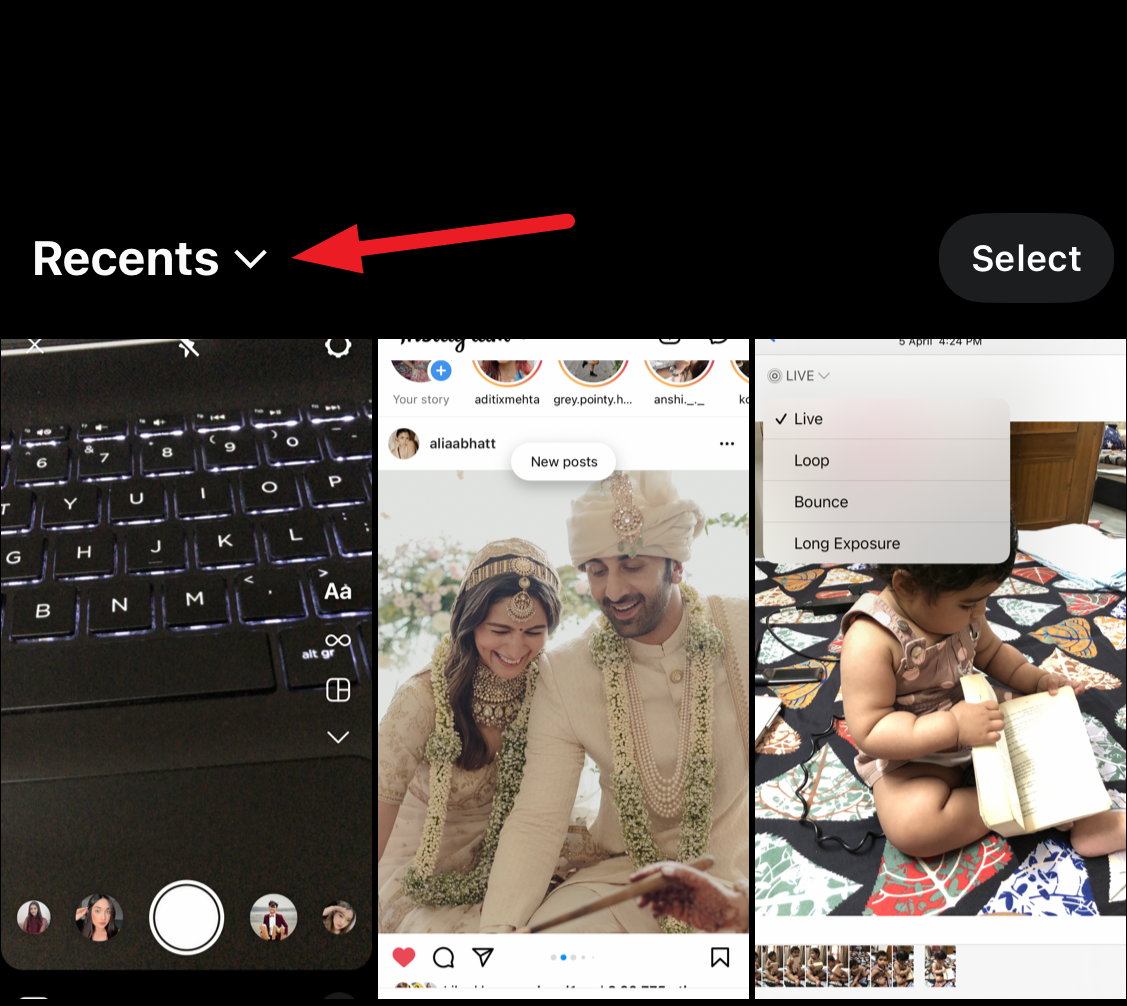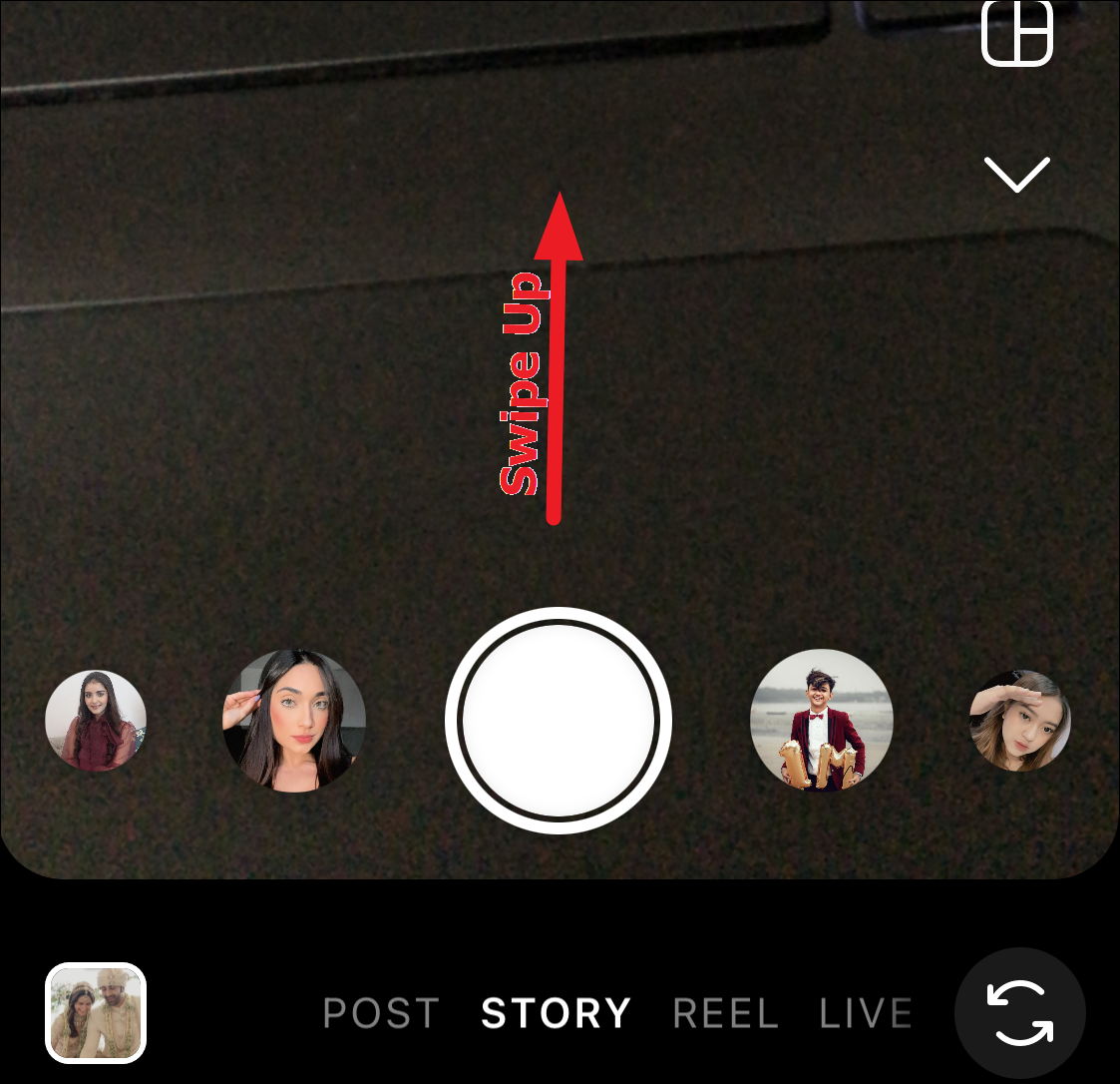 To make an existing live photo into a boomerang, swipe up from the Story screen to open your camera roll photos.
