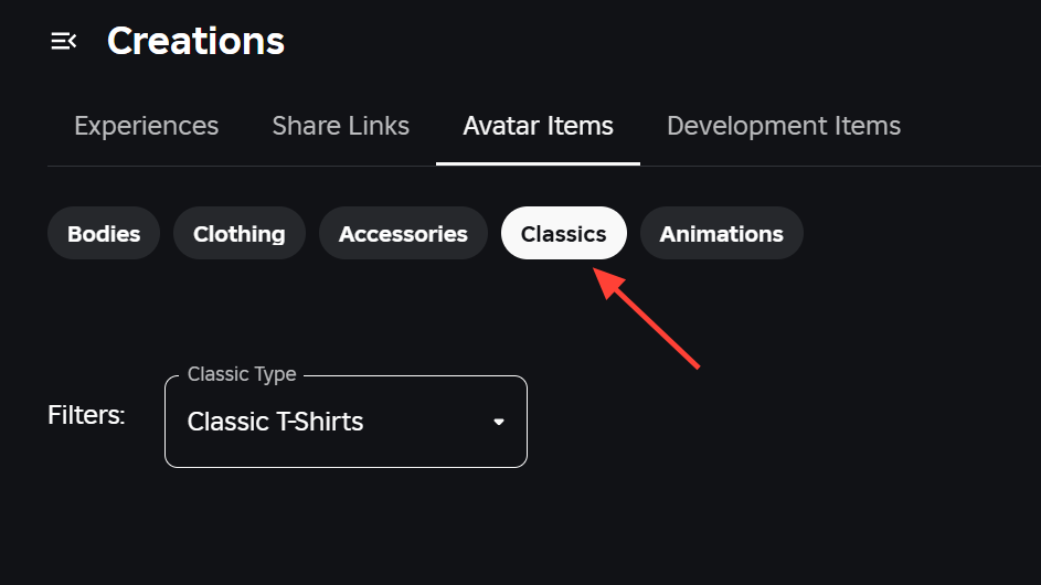 Step 1: Upload your item through Avatar Items → Classics as described above. Wait for moderation to complete.