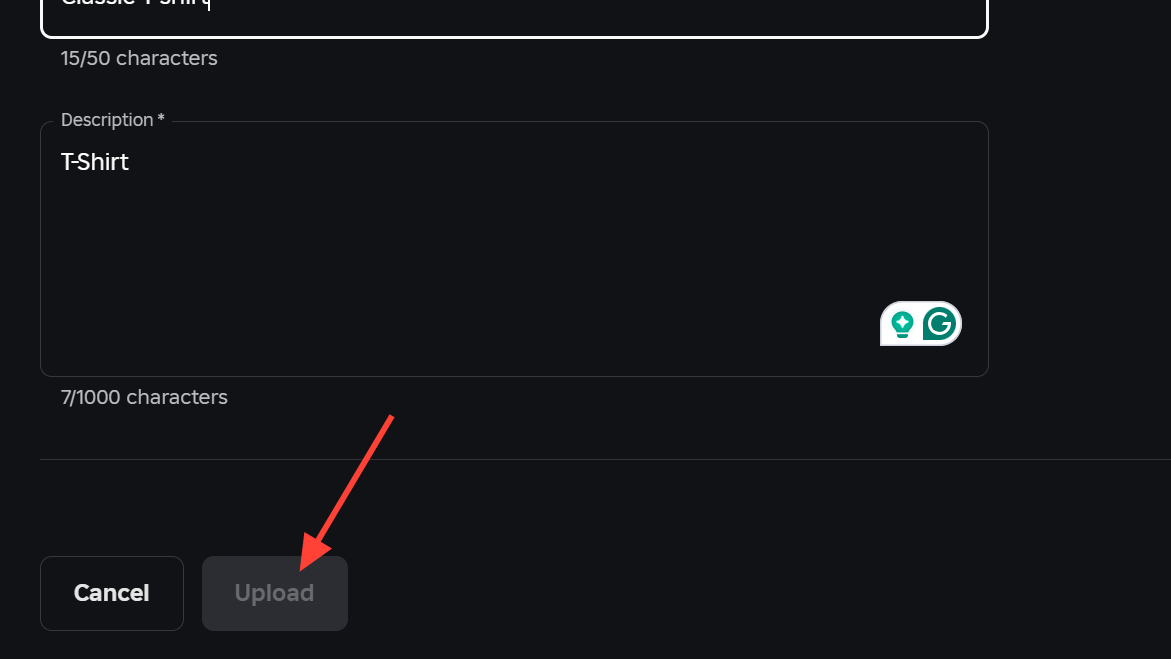 Step 9: Click Upload. After moderation passes, a copy is added to your inventory so you can wear or configure it.