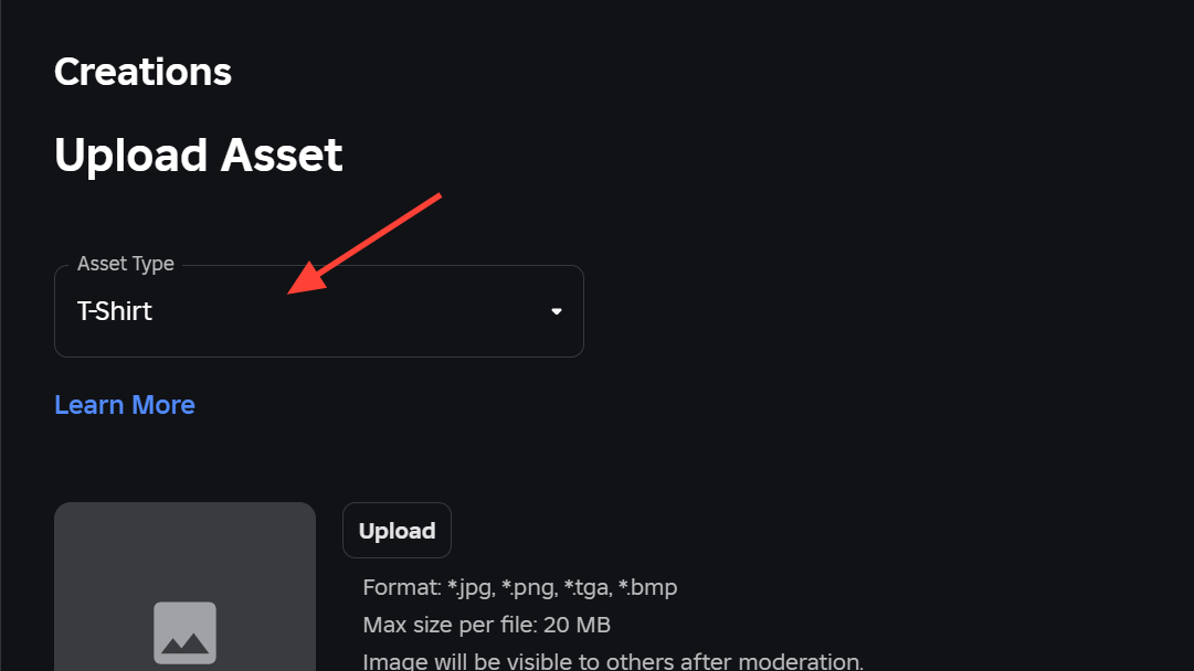 Step 3: Choose Upload Asset and set Asset Type to T‑shirt. Then select your square .png or .jpg file and upload.