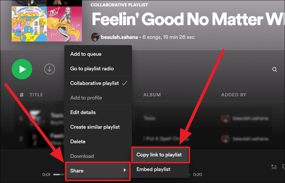 The chosen playlist is instantly open to collaboration. You can identify a collaborative playlist by the tiny icon of the outlines of two people next to it. Also, the menu option to make a playlist collaborative (‘Collaborative playlist’) will have a tick mark next to it.