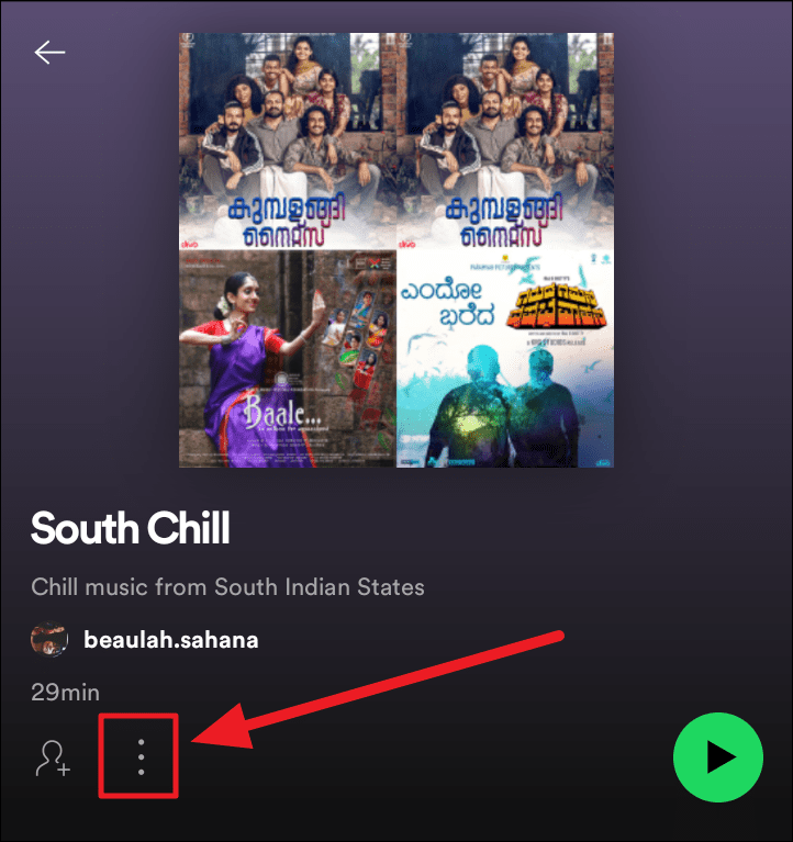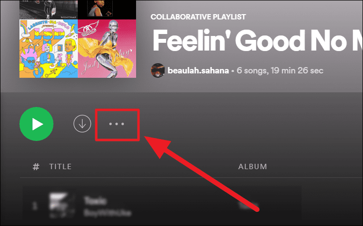 Once you’ve made the collaborative playlist, stay on the playlist’s page and click the ellipsis icon (three horizontal dots) below the playlist’s info.