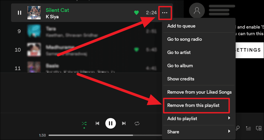 On your computer, reach the collaborative playlist, and hover the cursor over the song you want to remove, and tap the ellipsis icon (three horizontal dots). You can also double-finger tap on the song. Select ‘Remove from this playlist’ in the context menu.
