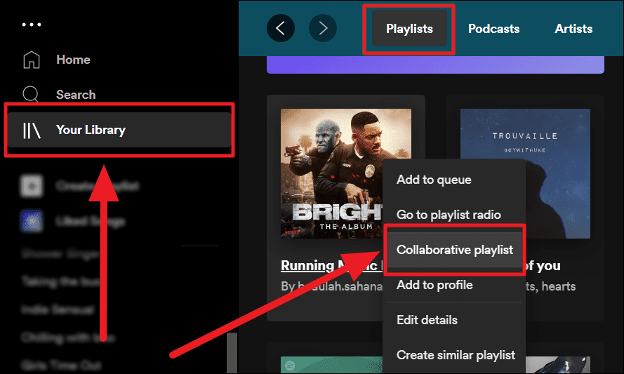 Choosing from your library. Click the ‘Your Library’ option to the top left of the screen and select the ‘Playlists’ tab on the right. Now, select the playlist you want to make collaborative. Double-finger tap or right-click on it and choose ‘Collaborative playlist’ from the menu.