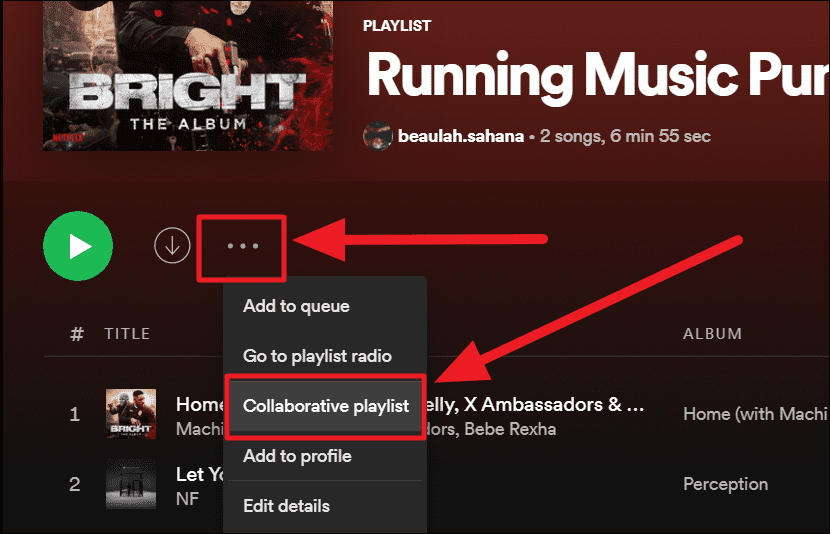 Choosing from the playlist’s page. Click to open a playlist you want to make collaborative. Now, click the ellipsis icon below the playlist’s information and select the ‘Collaborative playlist’ option from the menu.