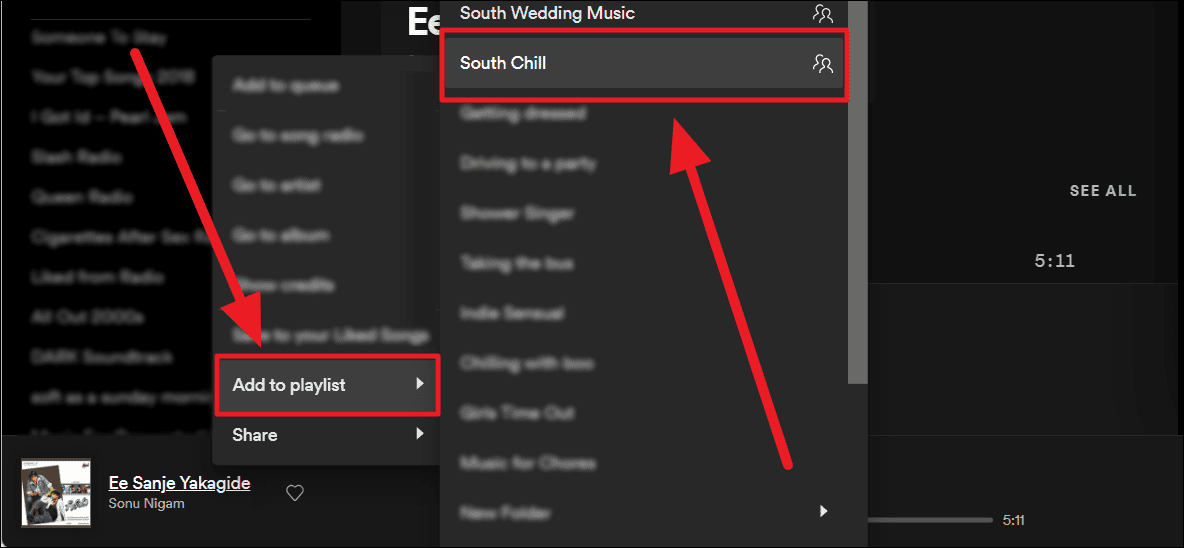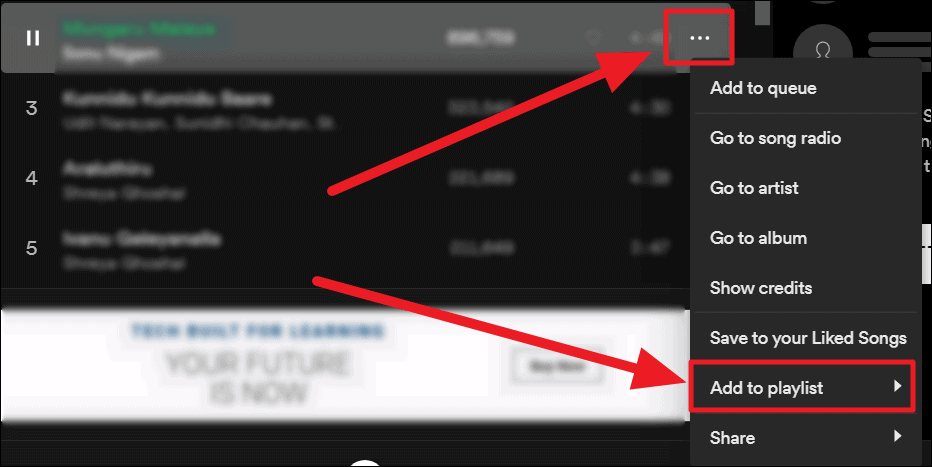 You can also open the song to view it individually or as part of a playlist. Hover the cursor over the song, tap the ellipsis icon (three horizontal dots), and select ‘Add to playlist’. Now, choose your collaborative playlist in the adjacent menu.