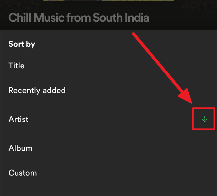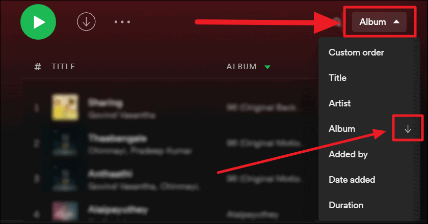 All options except ‘Custom’ can be arranged in an increasing or decreasing order. Simply click the ‘Arrow’ icon next to the chosen option to sort your playlist likewise.
