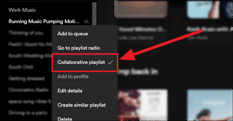 On your computer, simply double-finger tap or right-click on the playlist. Select the ‘Collaborative playlist’ option which has a tick mark.
