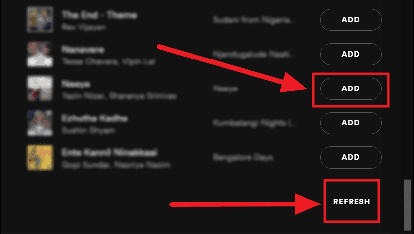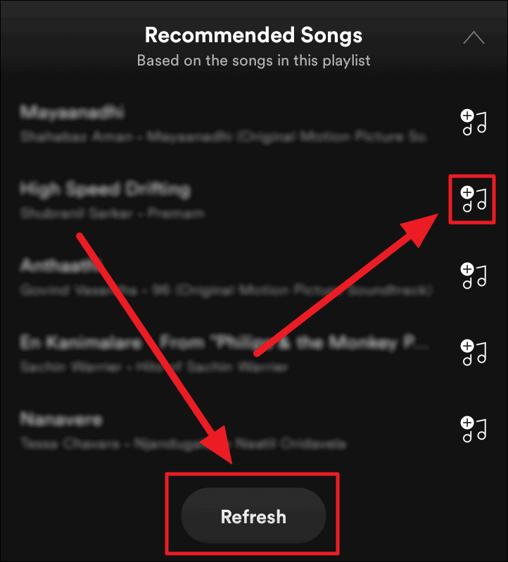 Method 2. Scroll to the bottom of your collaborative playlist to find Spotify’s recommendations. Tap the music note icon with a ‘+’ (plus) mark to add the track to the playlist. Hit the ‘Refresh’ button at the end of the list to refresh the recommendations.