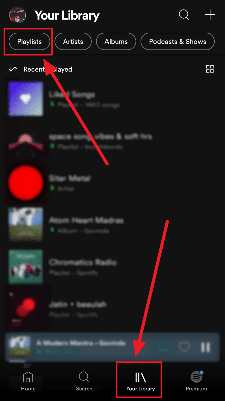 Open Spotify on your phone and tap the ‘Your Library’ to head to your Spotify library. Now, select the ‘Playlists’ tab at the top of the screen.