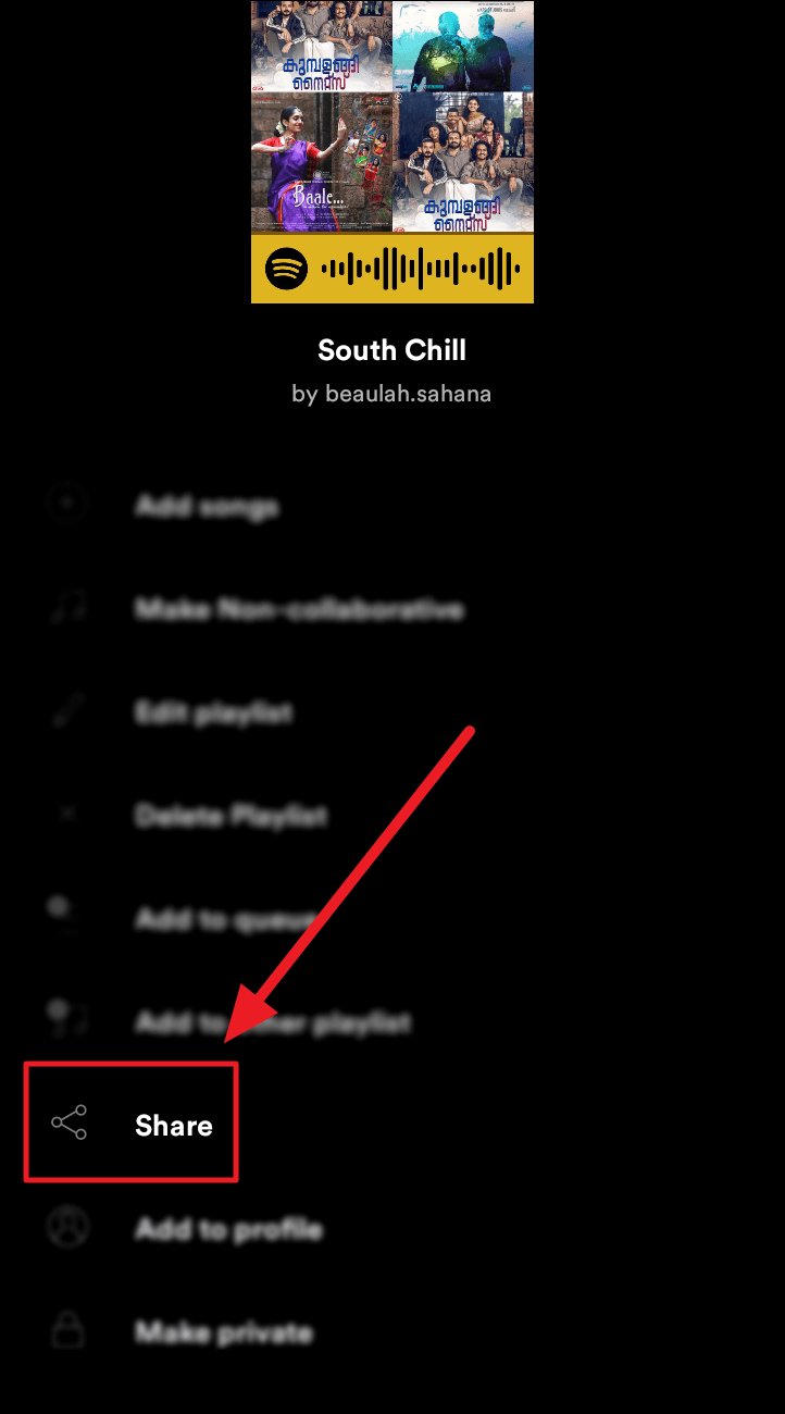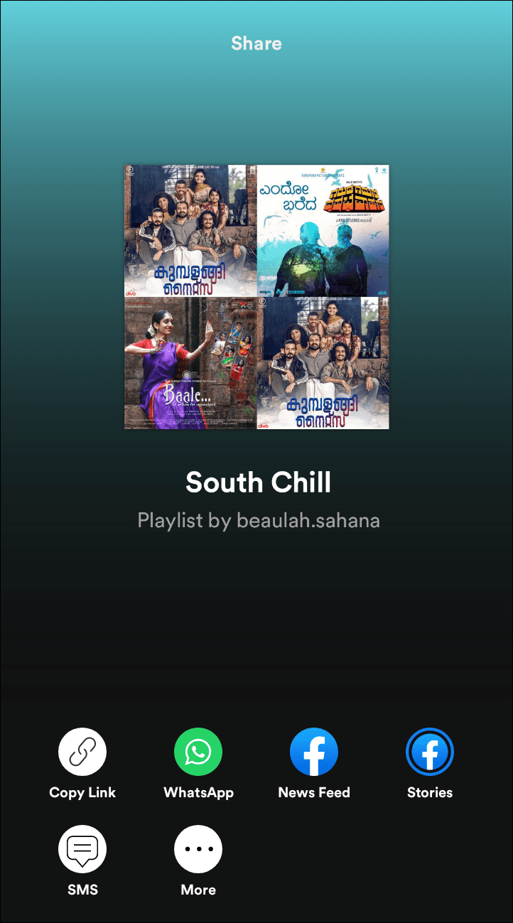 The next screen you see is the ‘Share’ screen. Choose your sharing option here and directly share the link to your collaborative playlist.