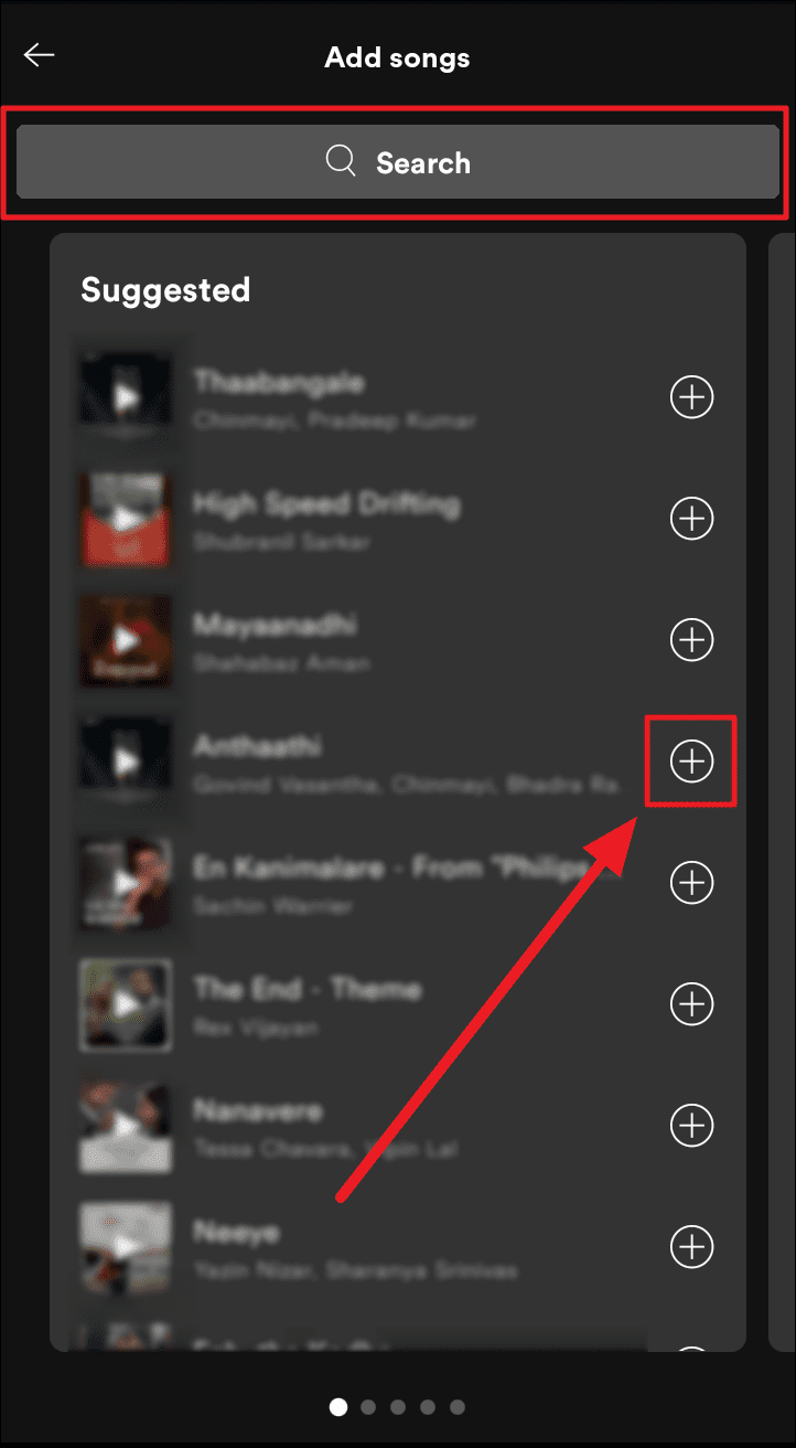You can either search for the songs manually in the ‘Search’ field and add them or you can add them by tapping the ‘+’ button next to Spotify’s suggestions. Swipe through these ‘Suggested’ cards to find more recommendations coming from different spaces like your ‘Liked songs’, and ‘Recently Played’, in addition to Spotify’s suggestions.