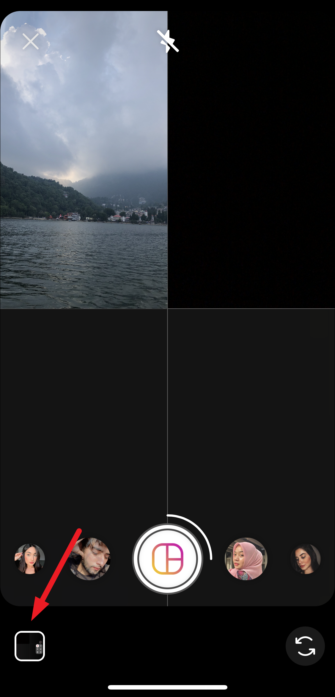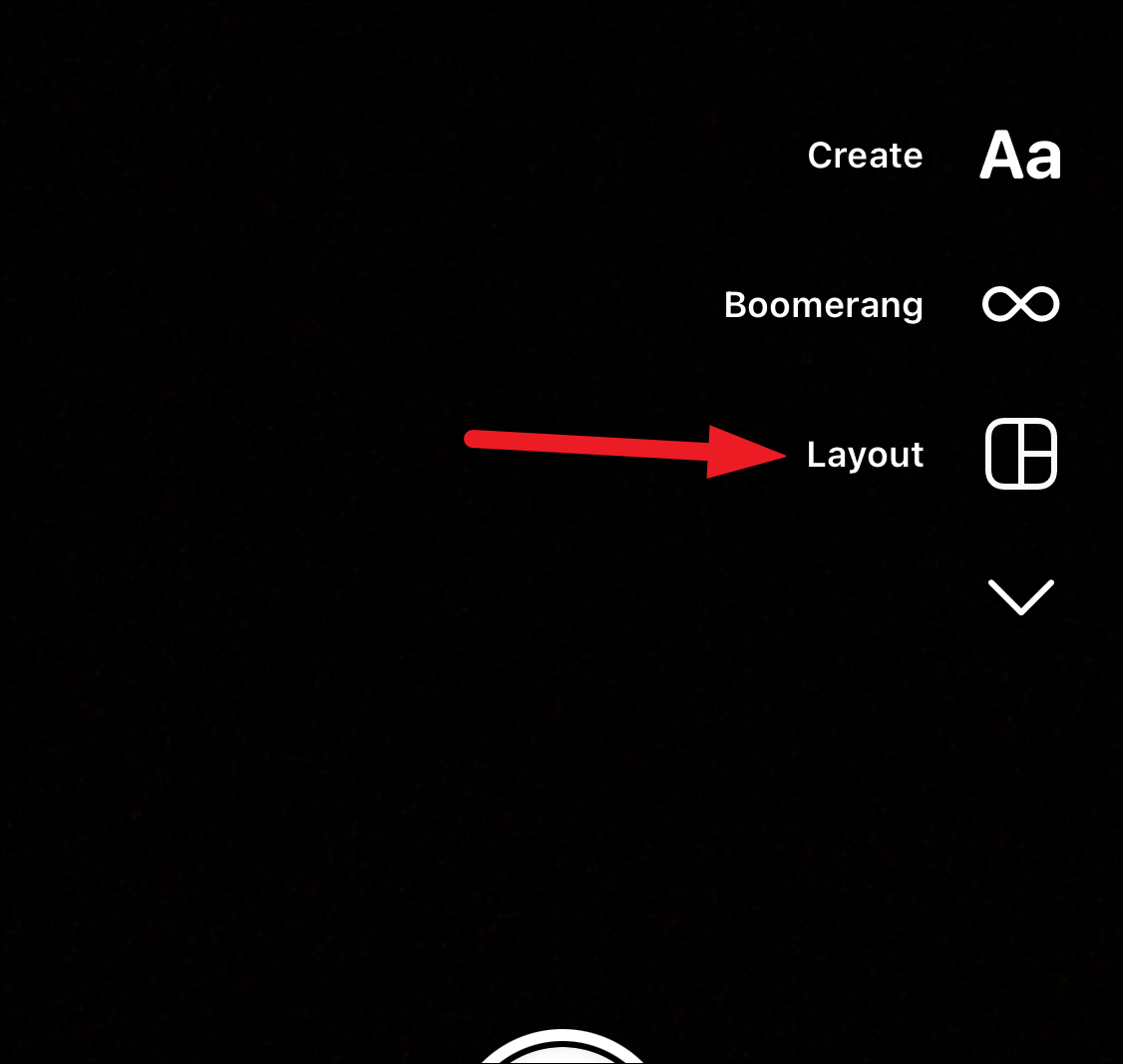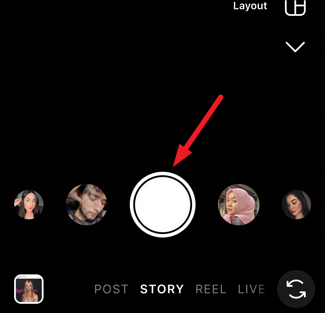 To create a collage using Layout, swipe right from the Home tab to open the screen o add a story on the left. Then, tap the ‘Layout’ option from the options on the right edge of the screen.